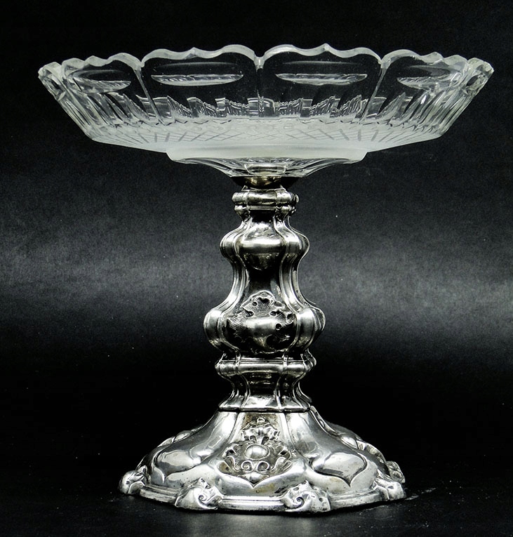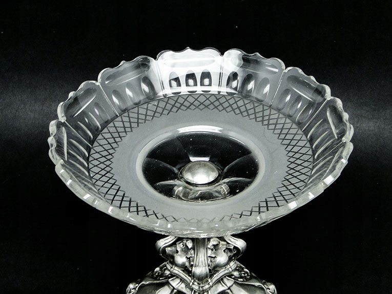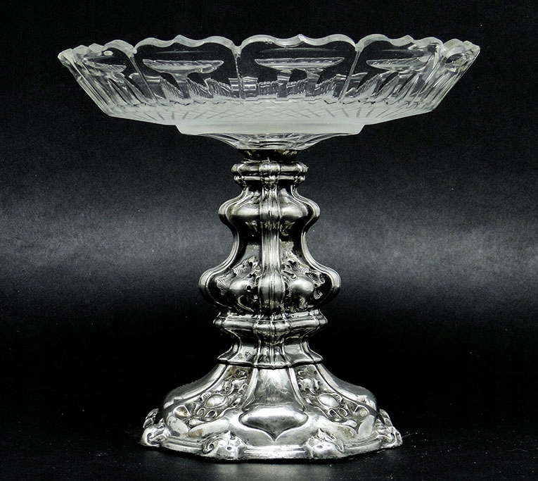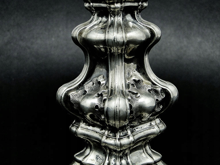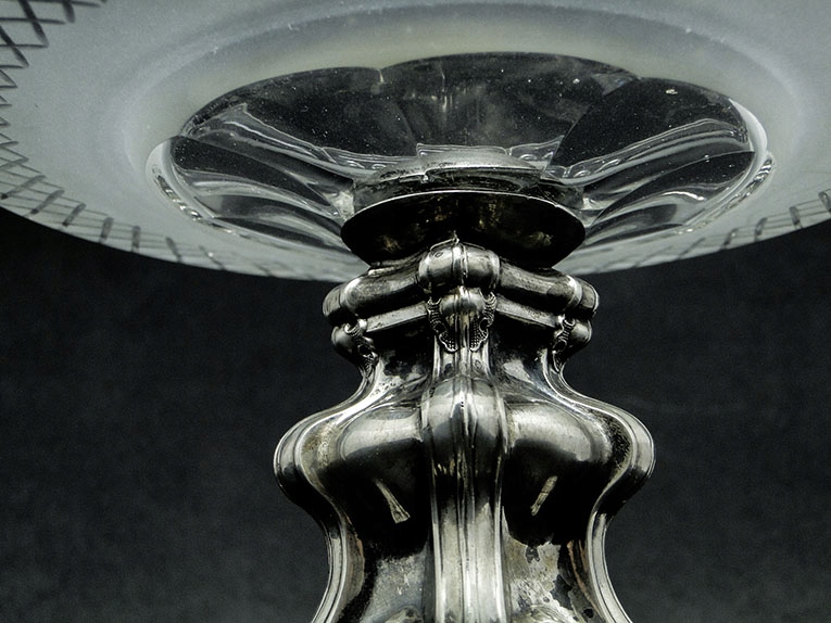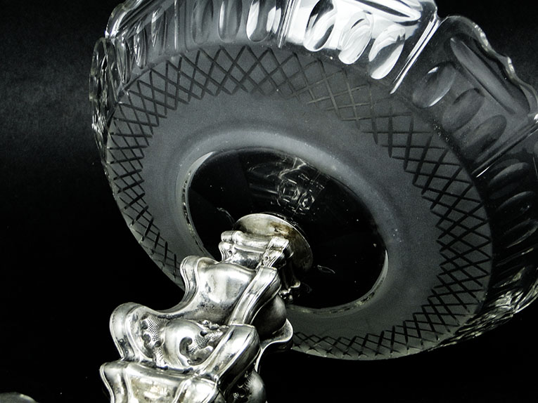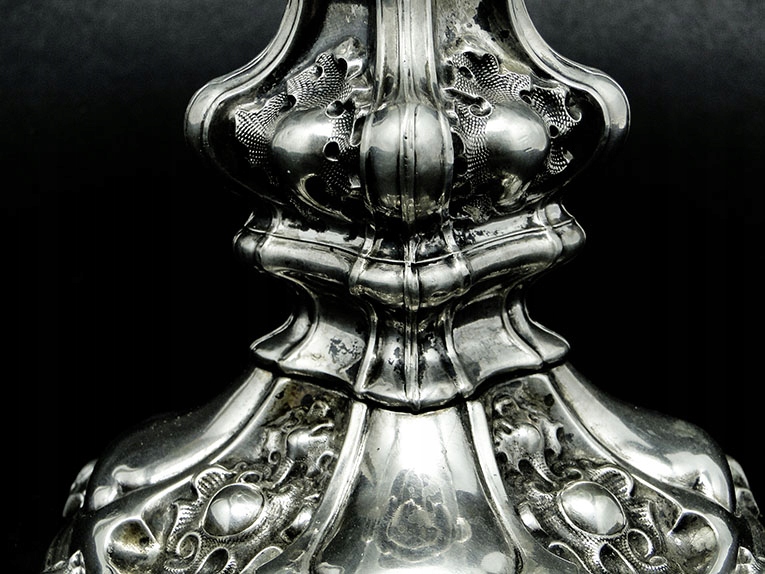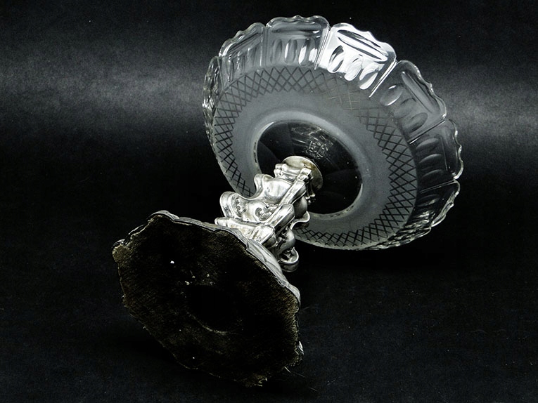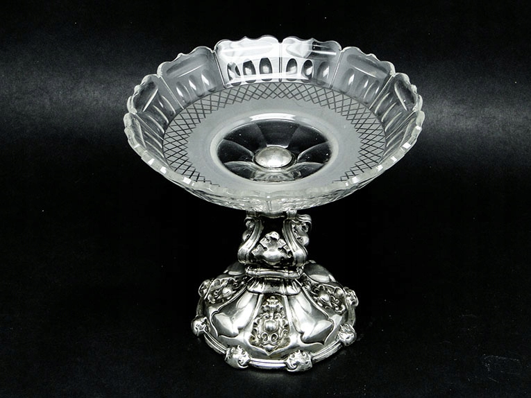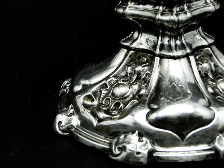 Sposób wykonania: Stopa ze srebra jest wytłocznona i osadzona na stopie wykonanej techniką kalifonii. Wzory przedstawione na niej są wykonane w stylu biedermeier.