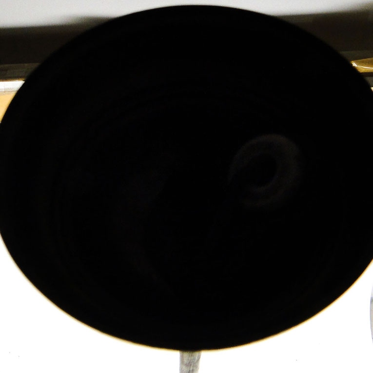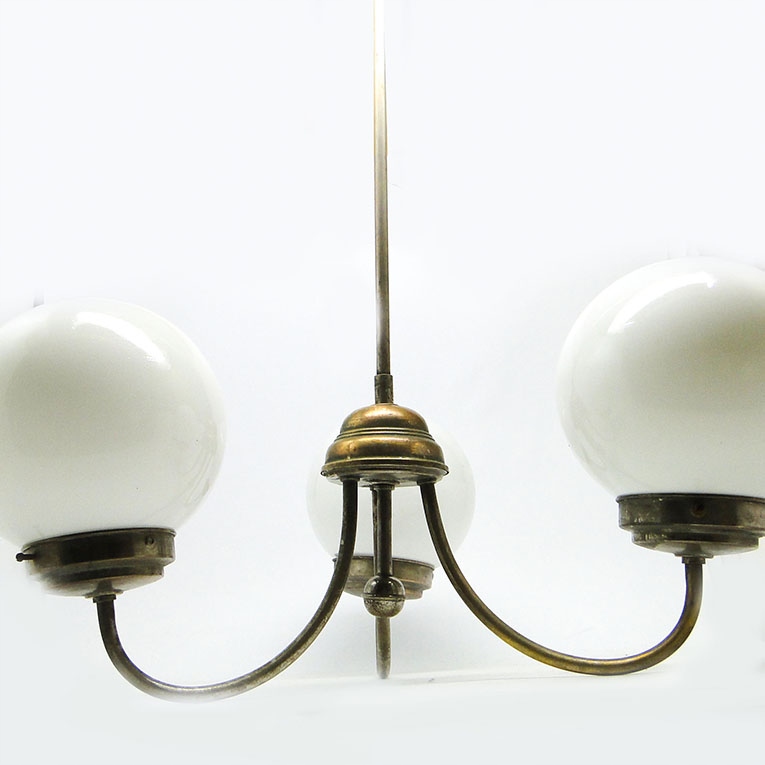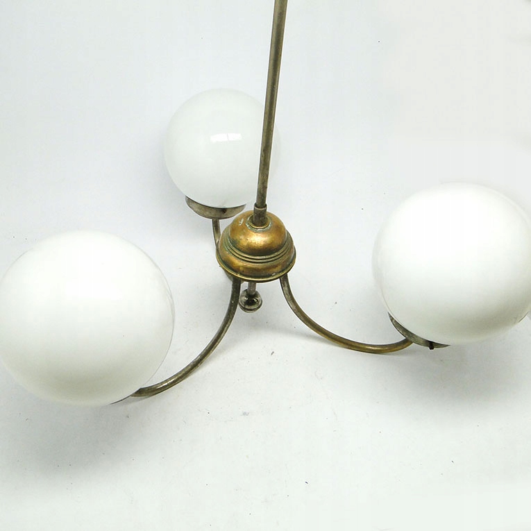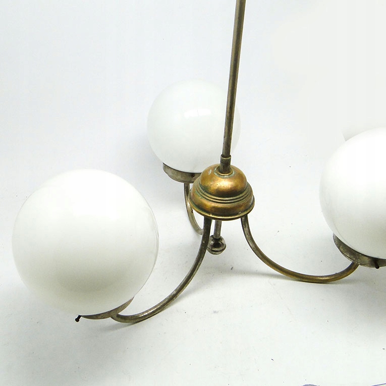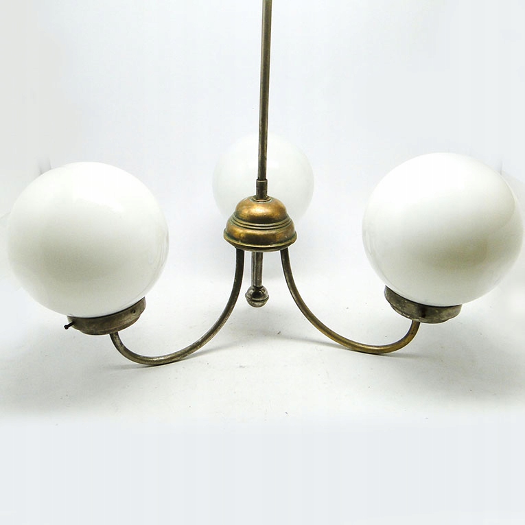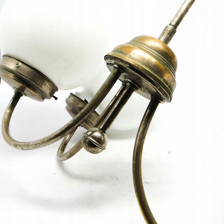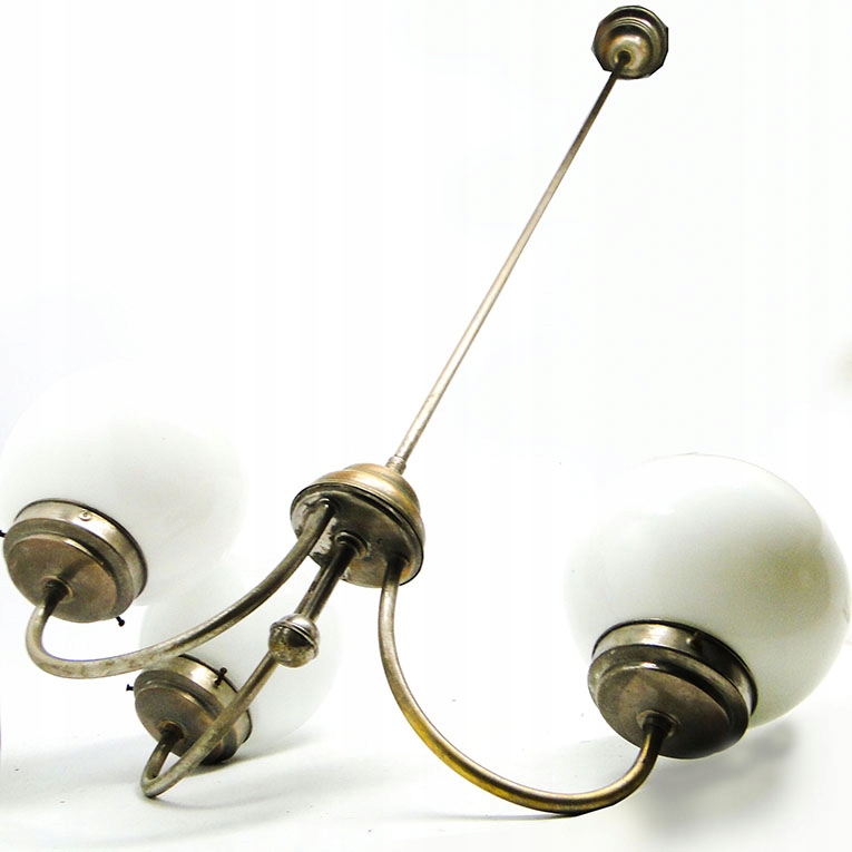 Żyrandol został wyprodukowany w latach 30. Konstrukcja jest mosiężna i pokryta chromem, klosze szklane. Zachowany jest w dobrym stanie, sprawny technicznie.