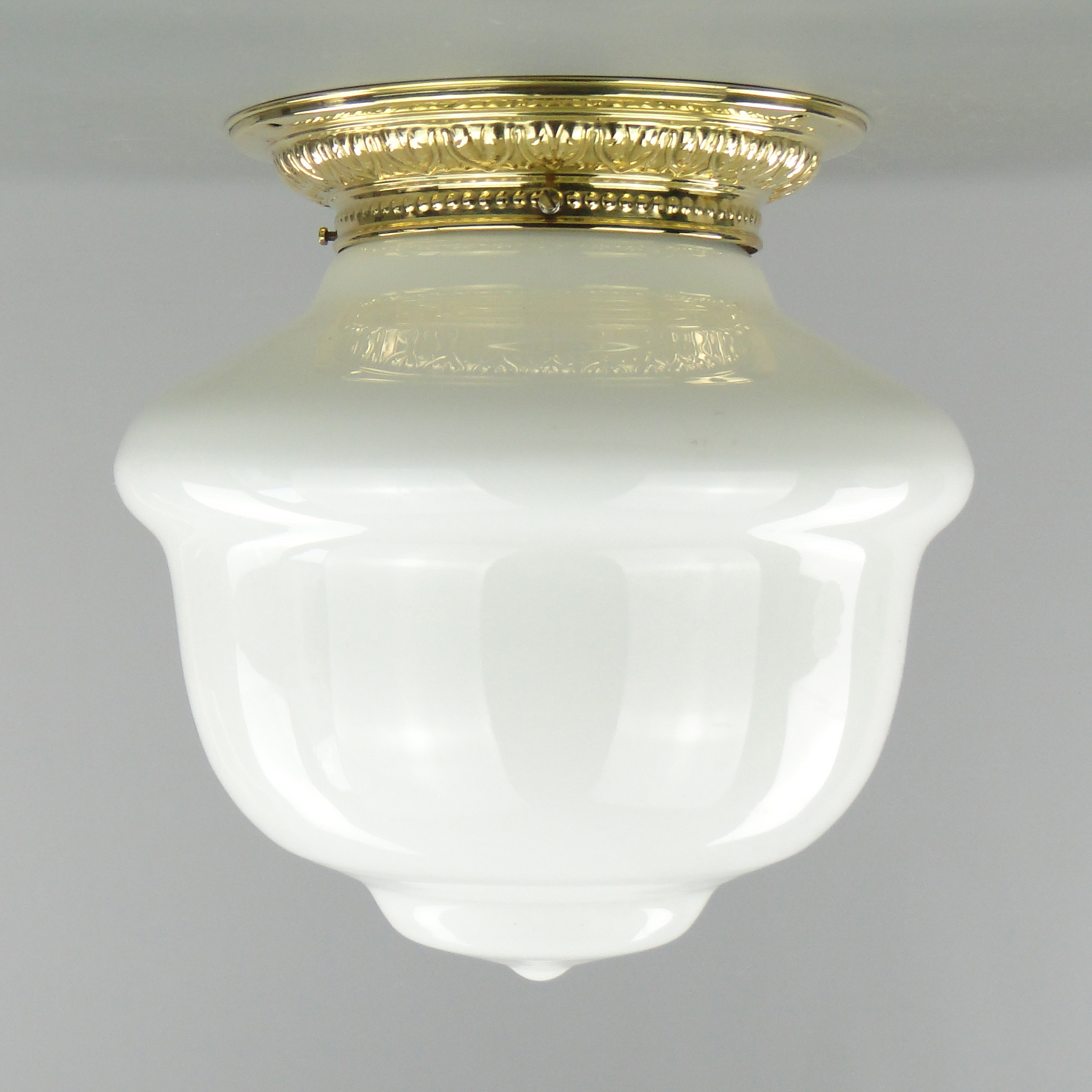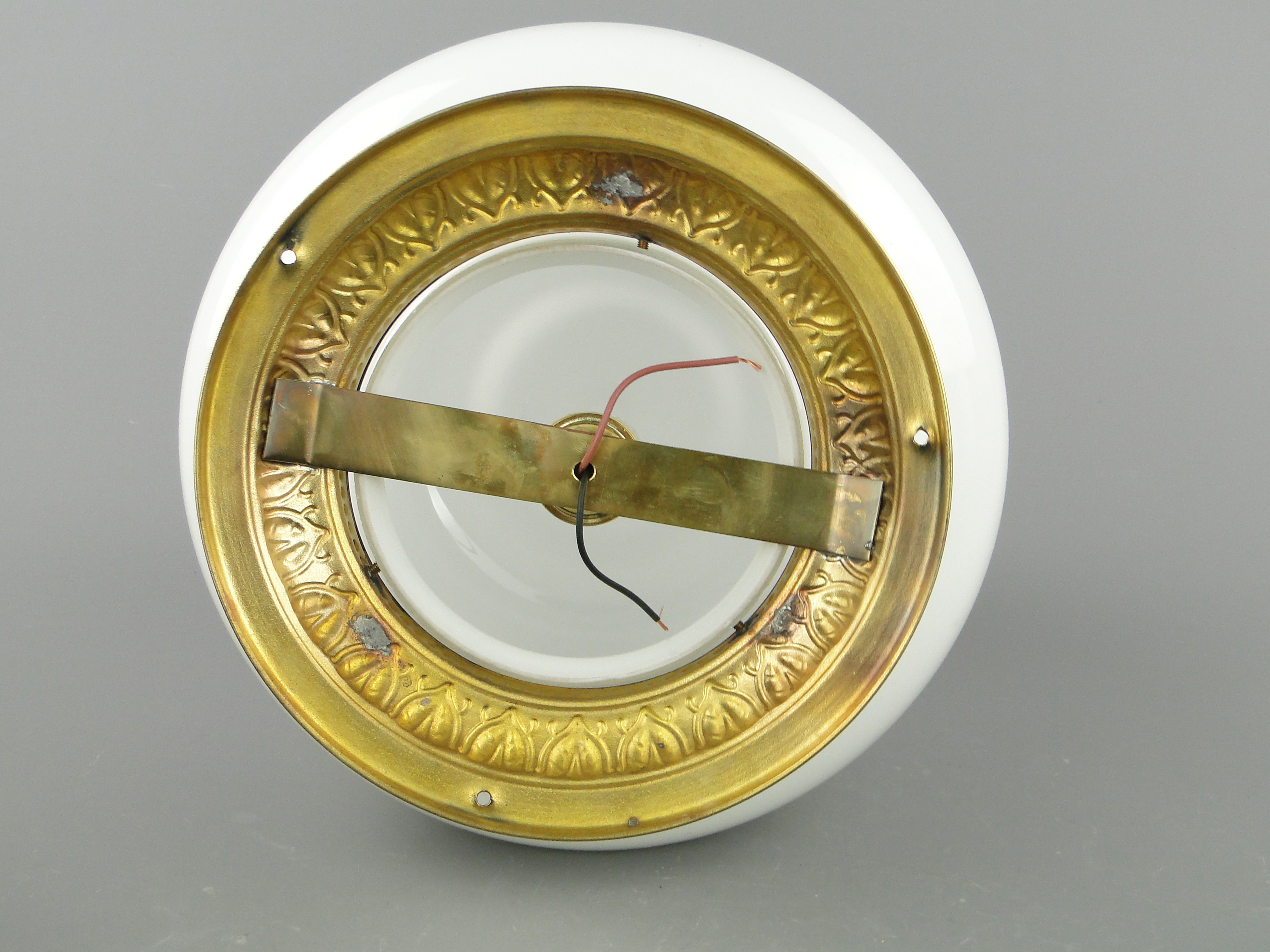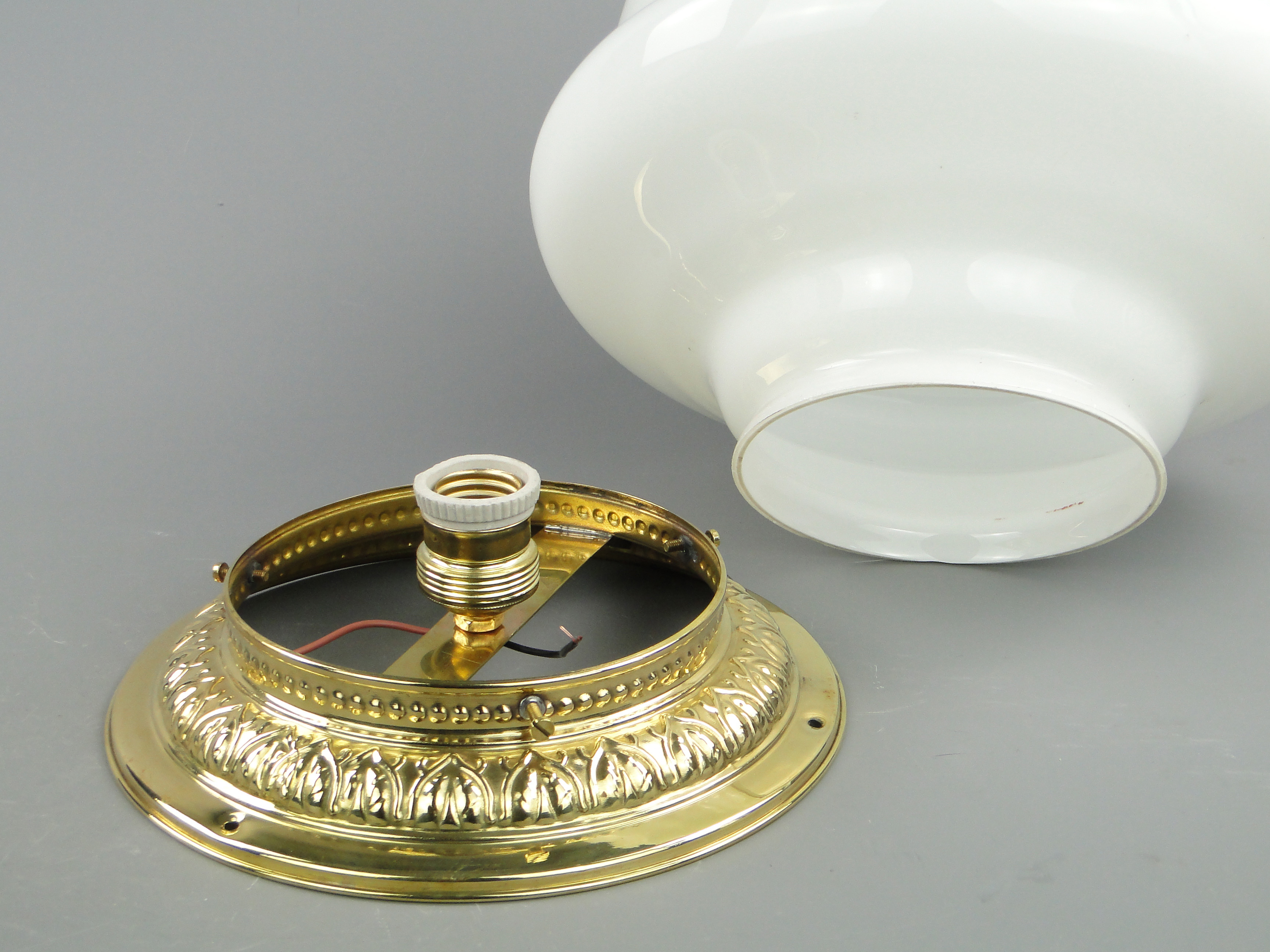Podstawa lampy wykonana jest mosiądzu, klosz ze szkła profilowanego, białego.