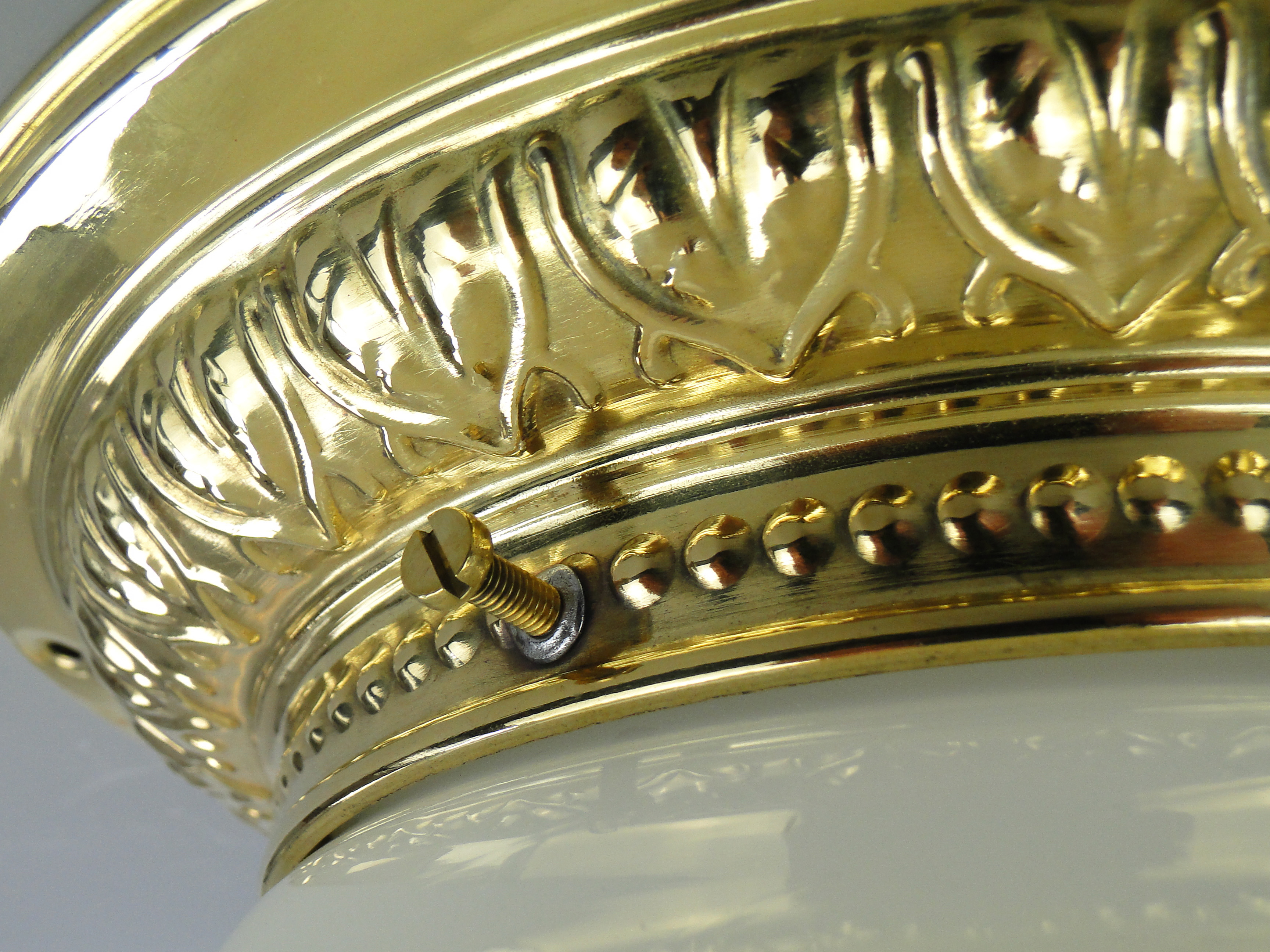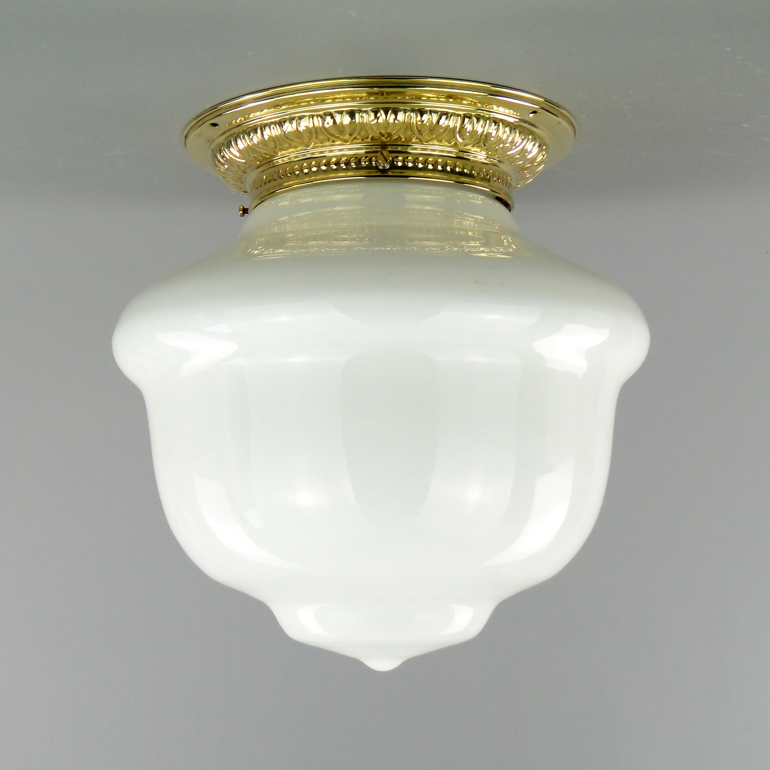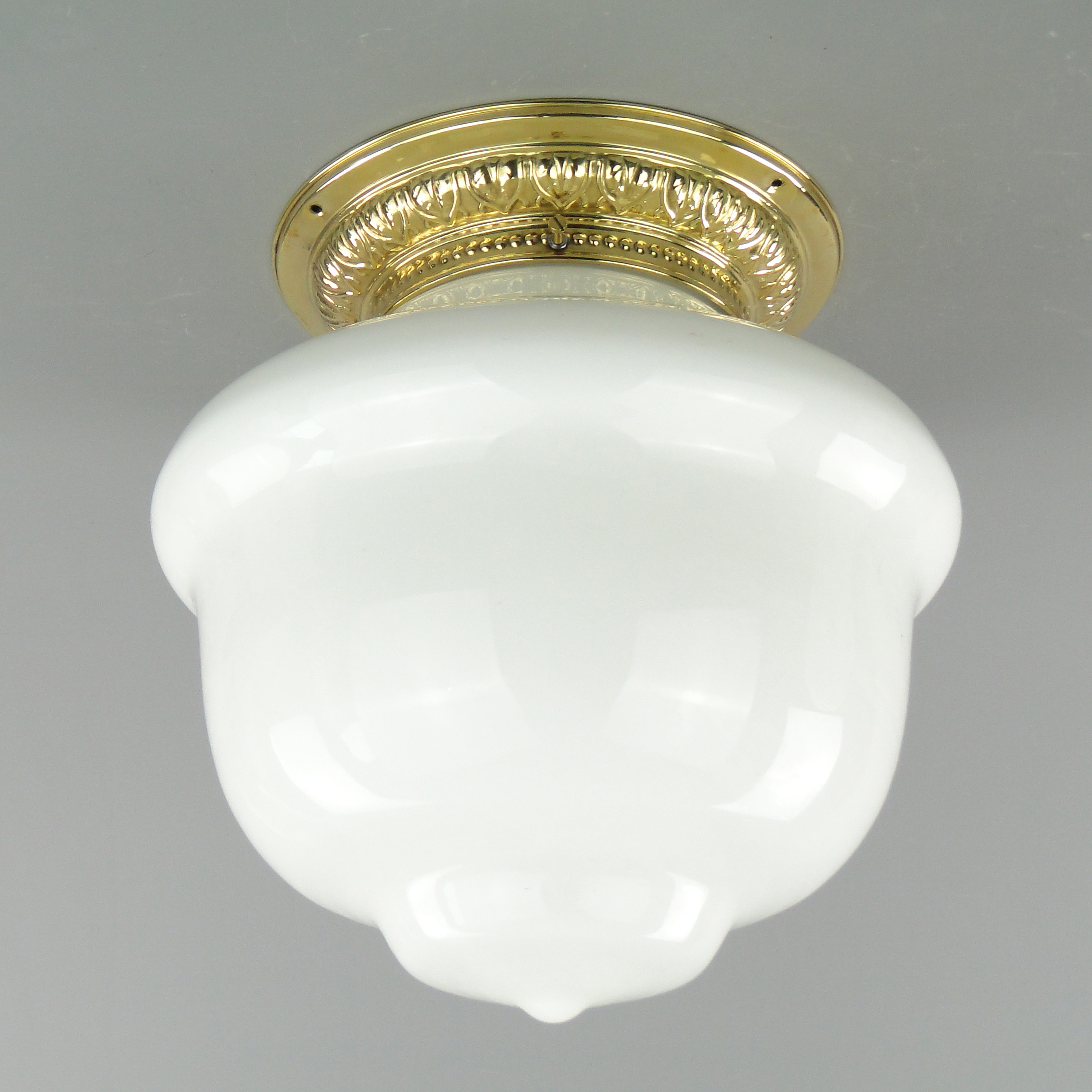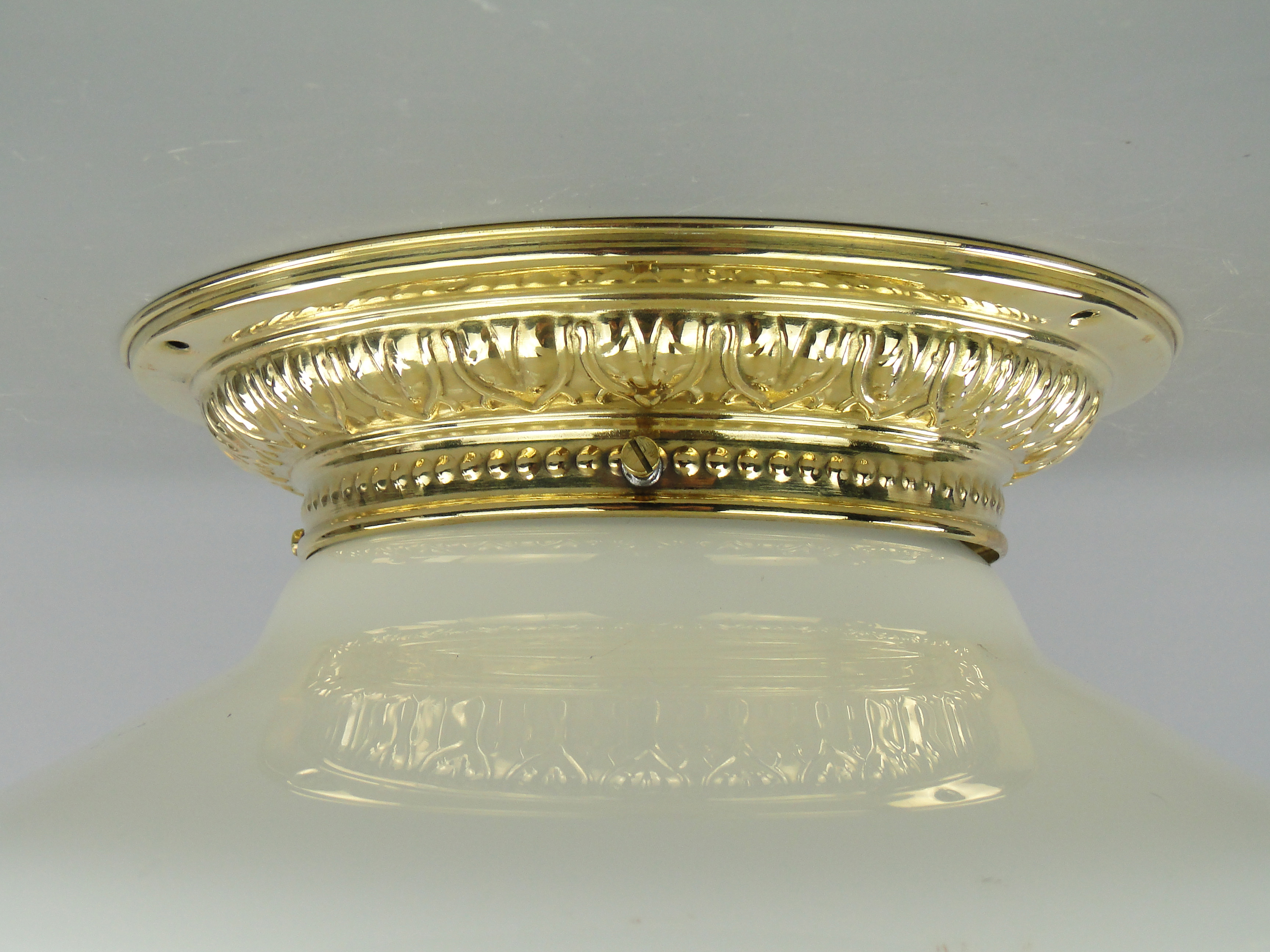 Podstawa lampy wykonana jest mosiądzu, klosz ze szkła profilowanego, białego.