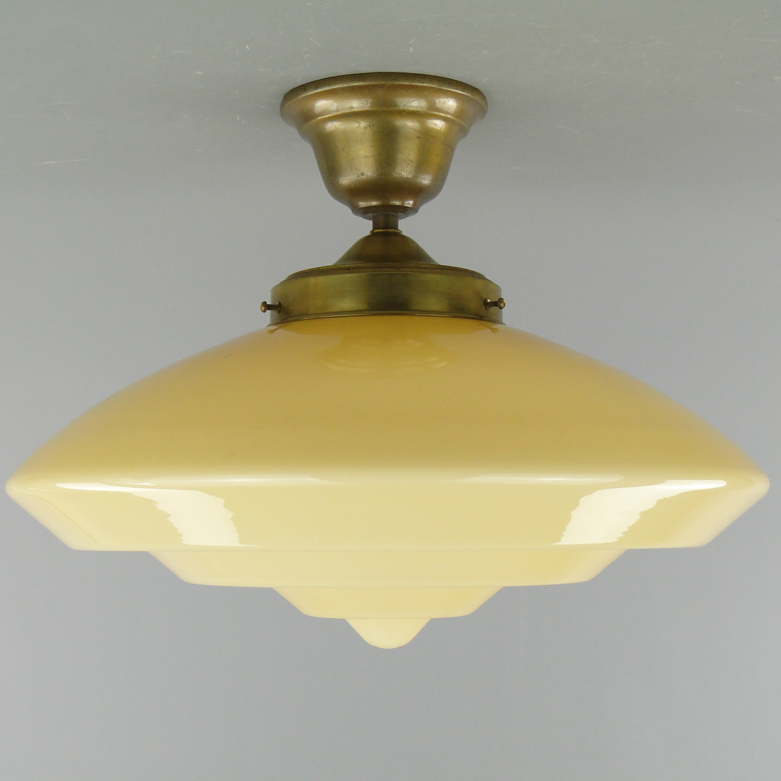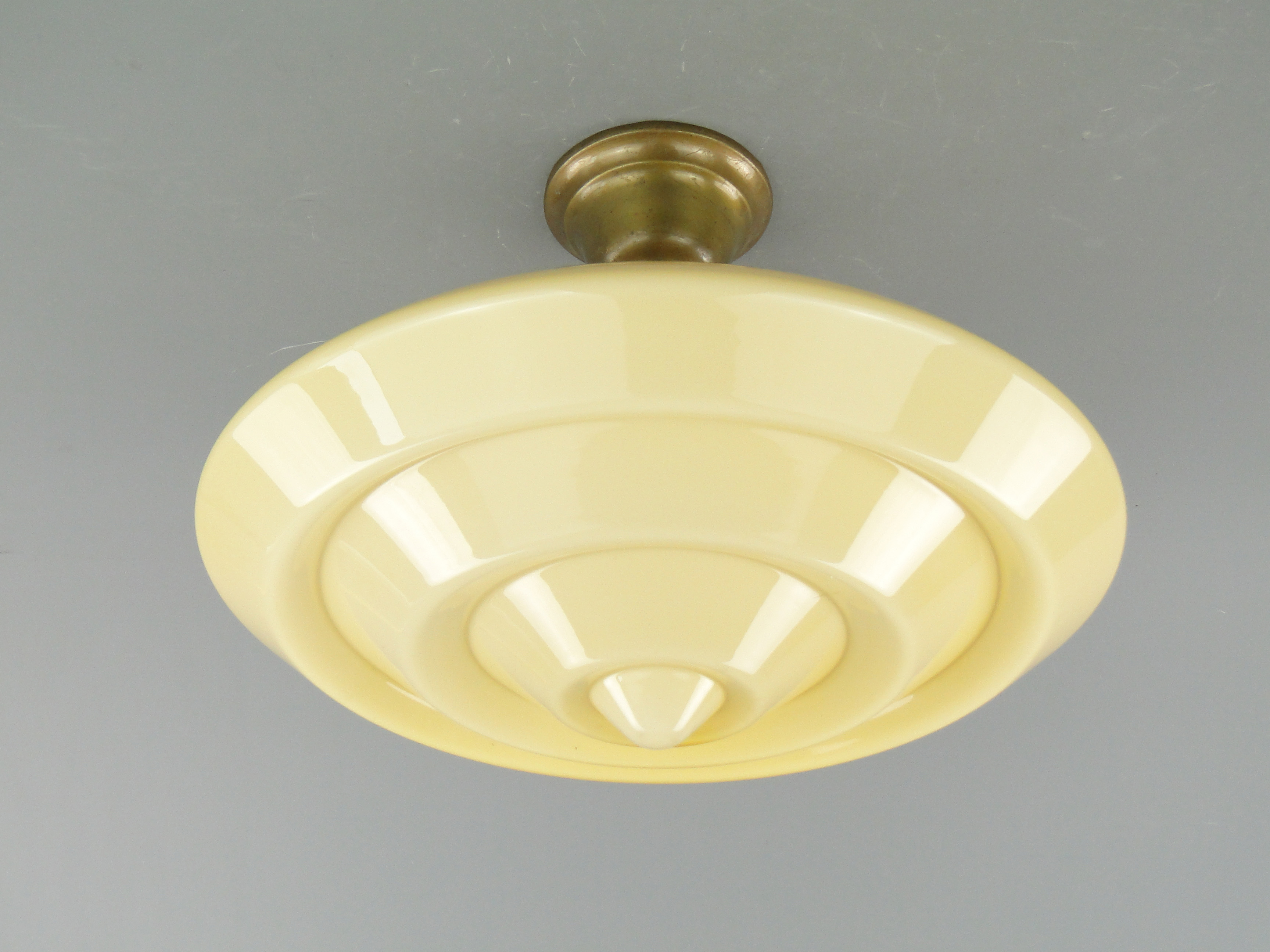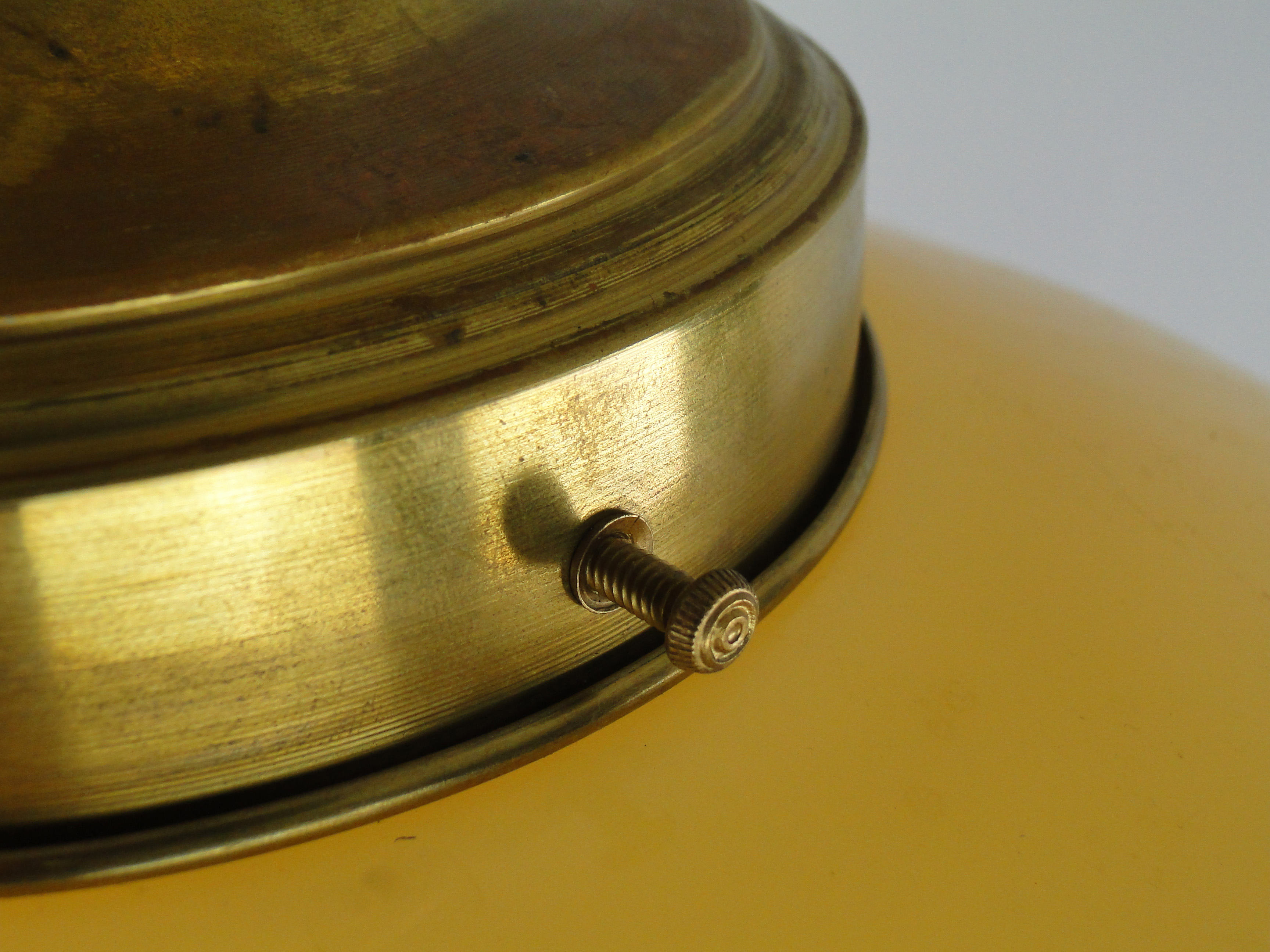 Podstawa lampy wykonana jest mosiądzu, klosz ze szkła profilowanego, warstwowego w kremowym kolorze.