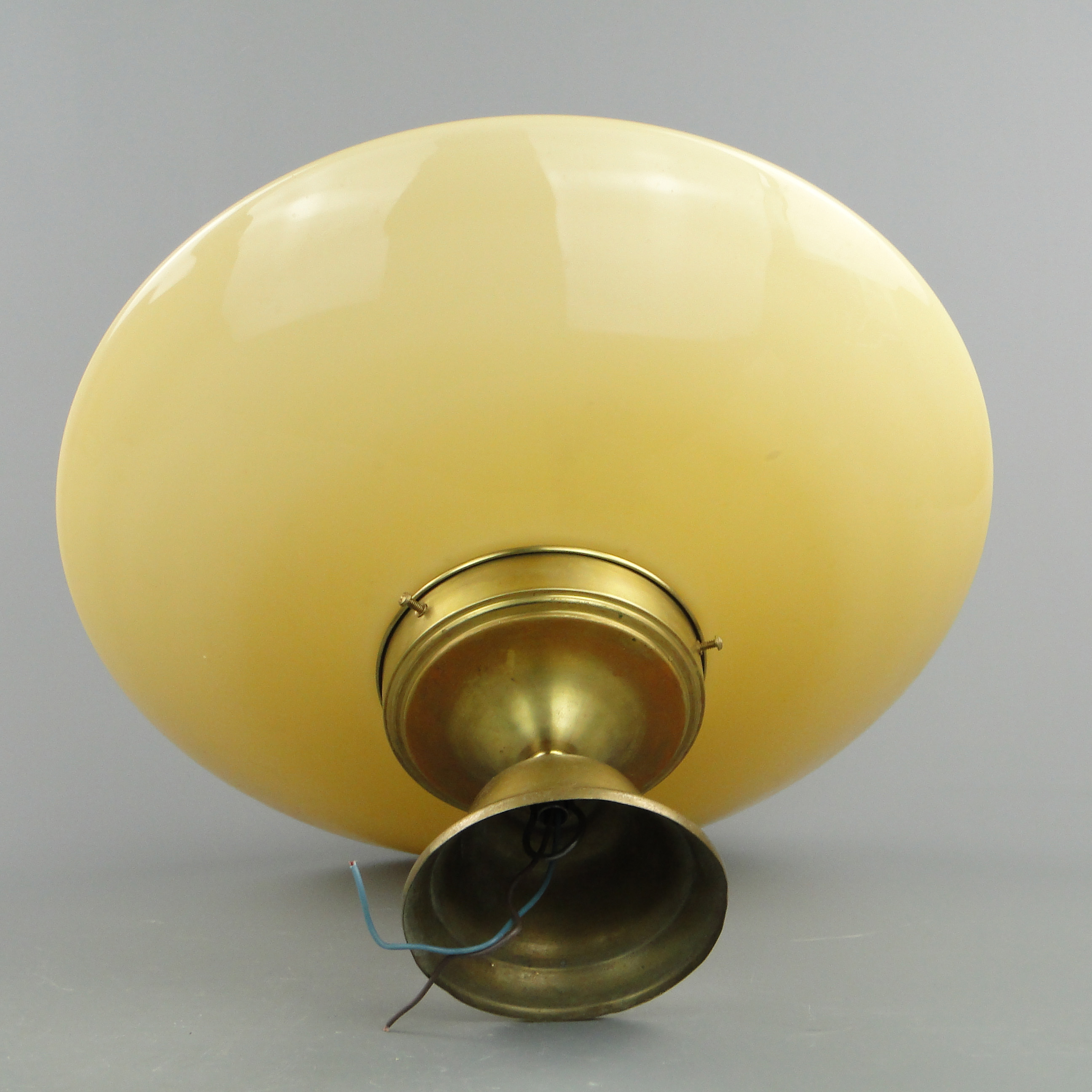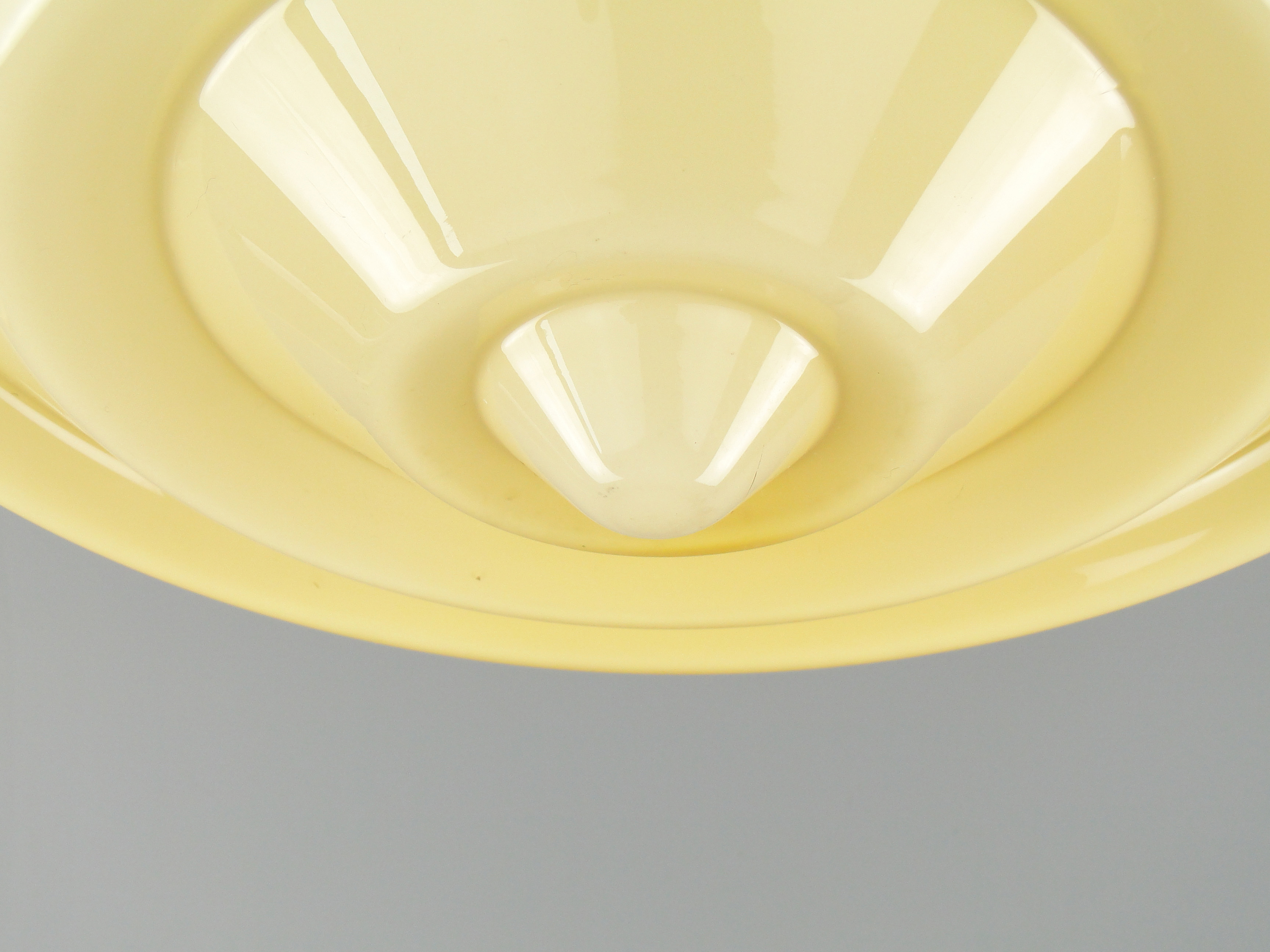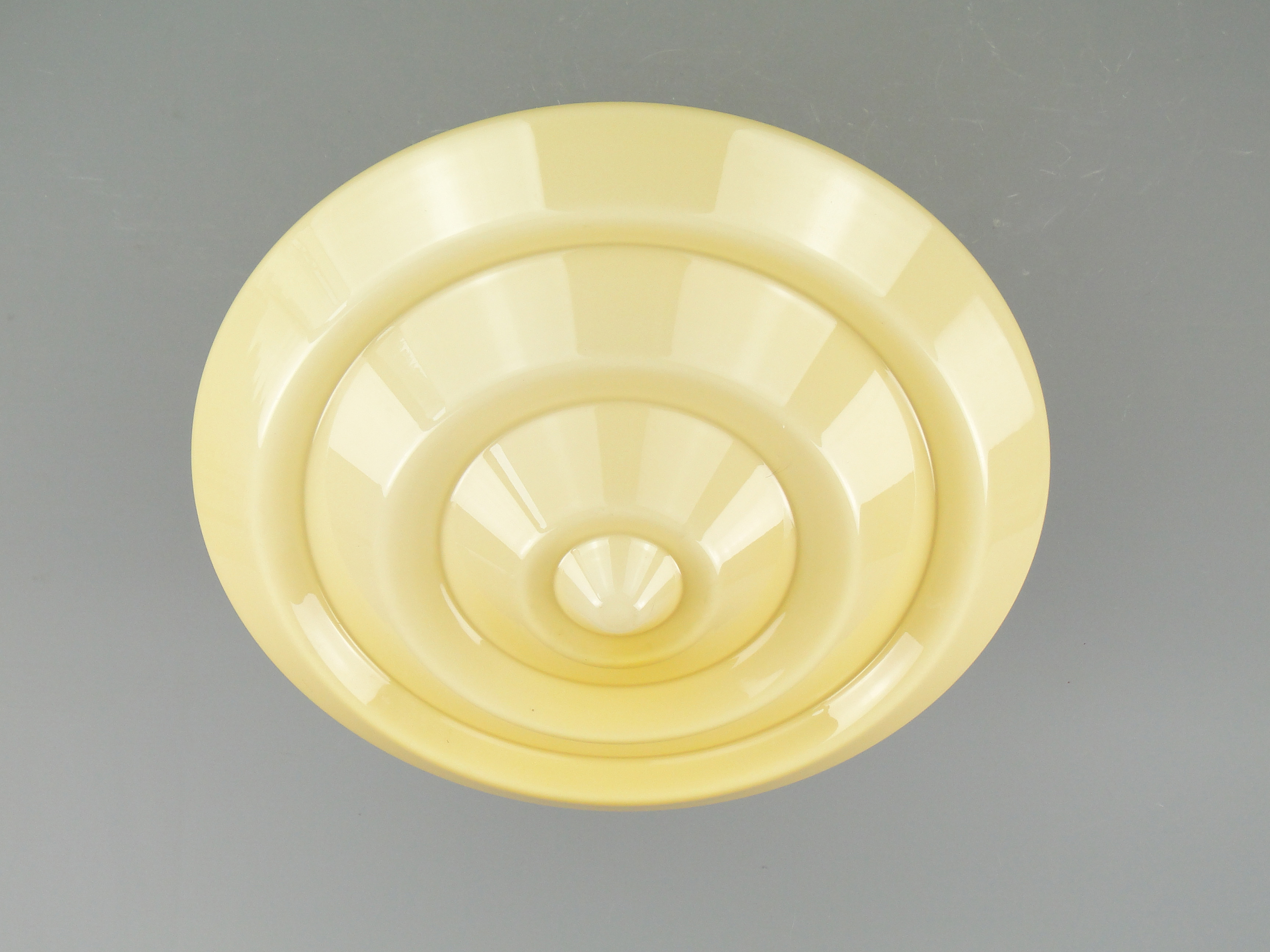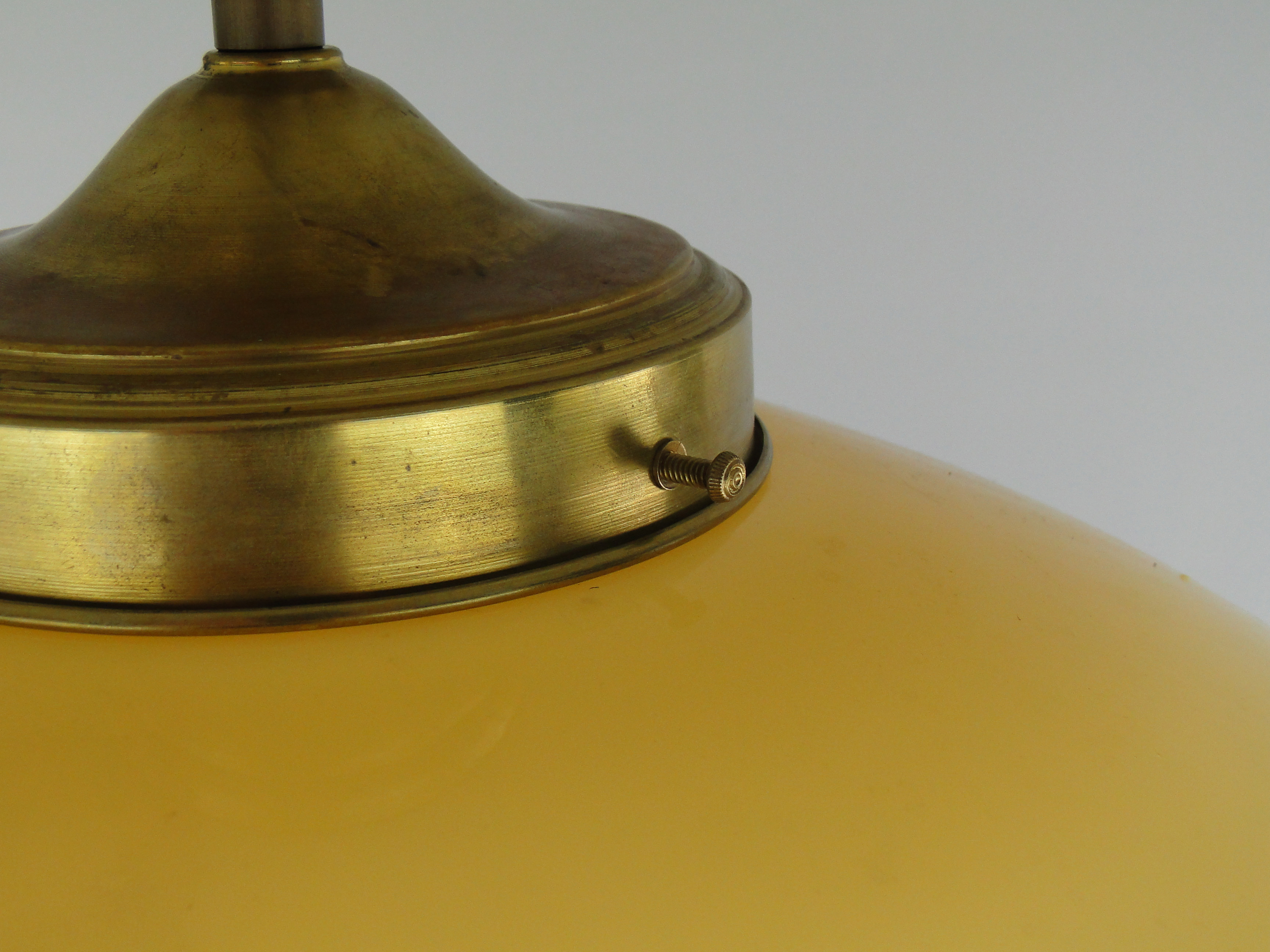 Podstawa lampy wykonana jest mosiądzu, klosz ze szkła profilowanego, warstwowego w kremowym kolorze.