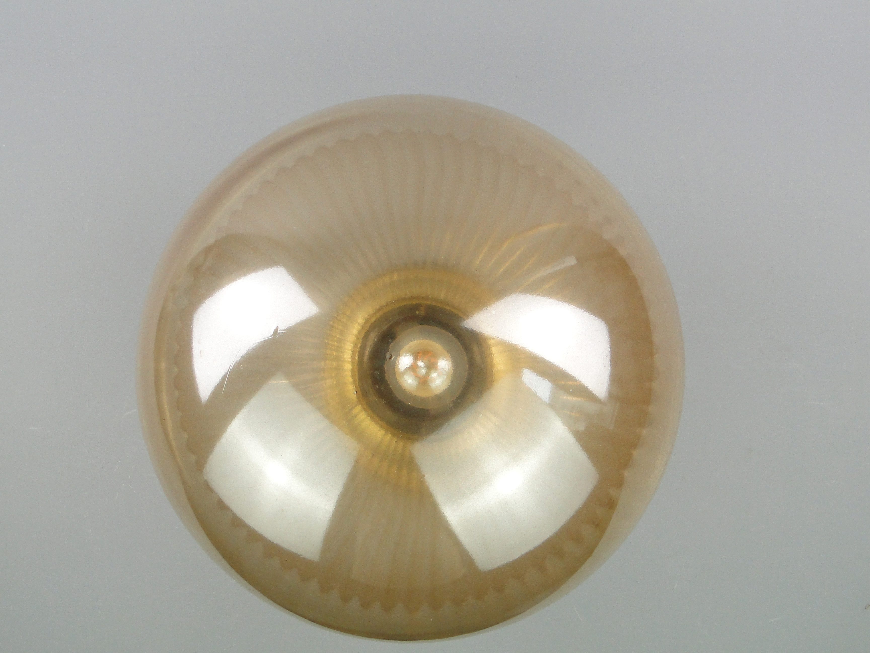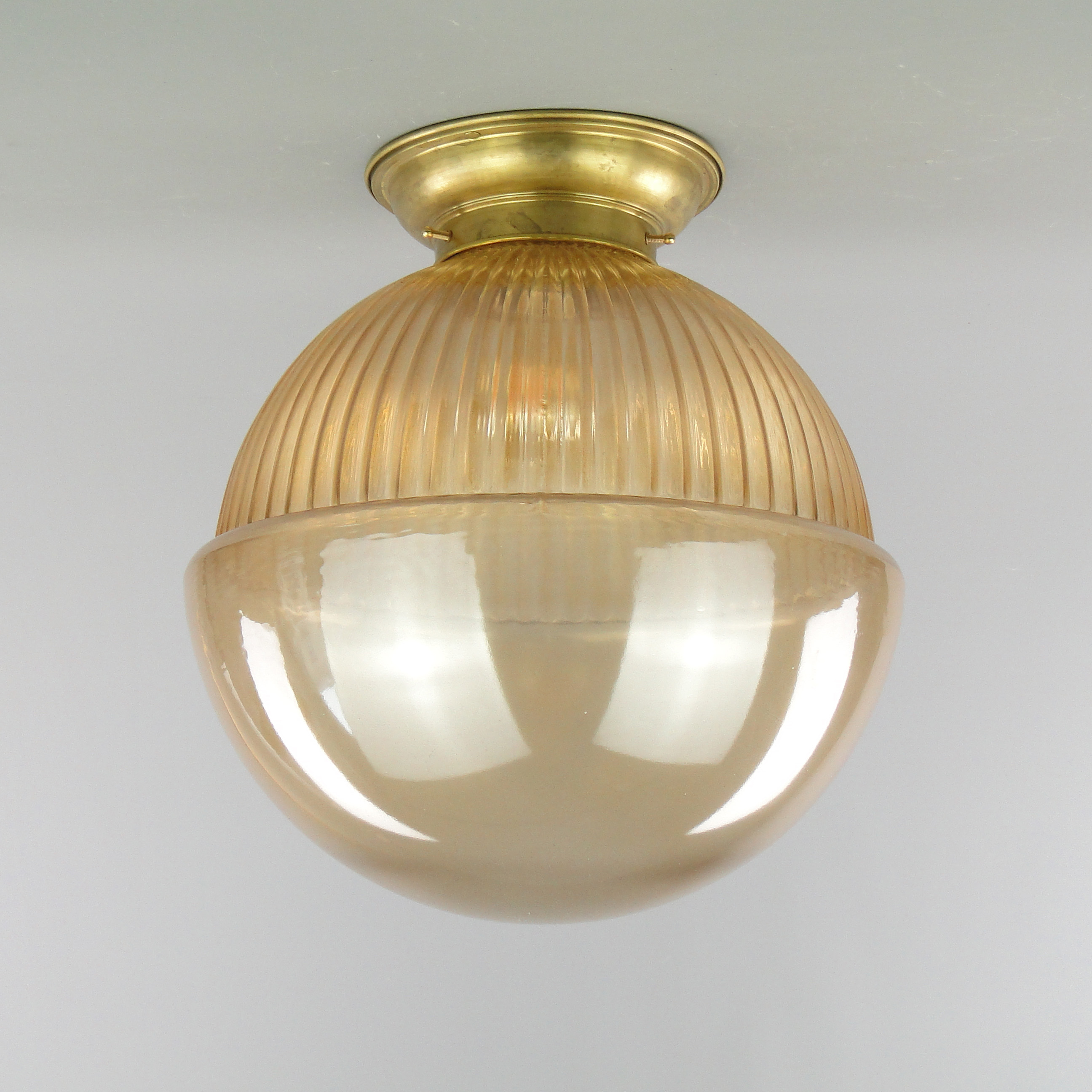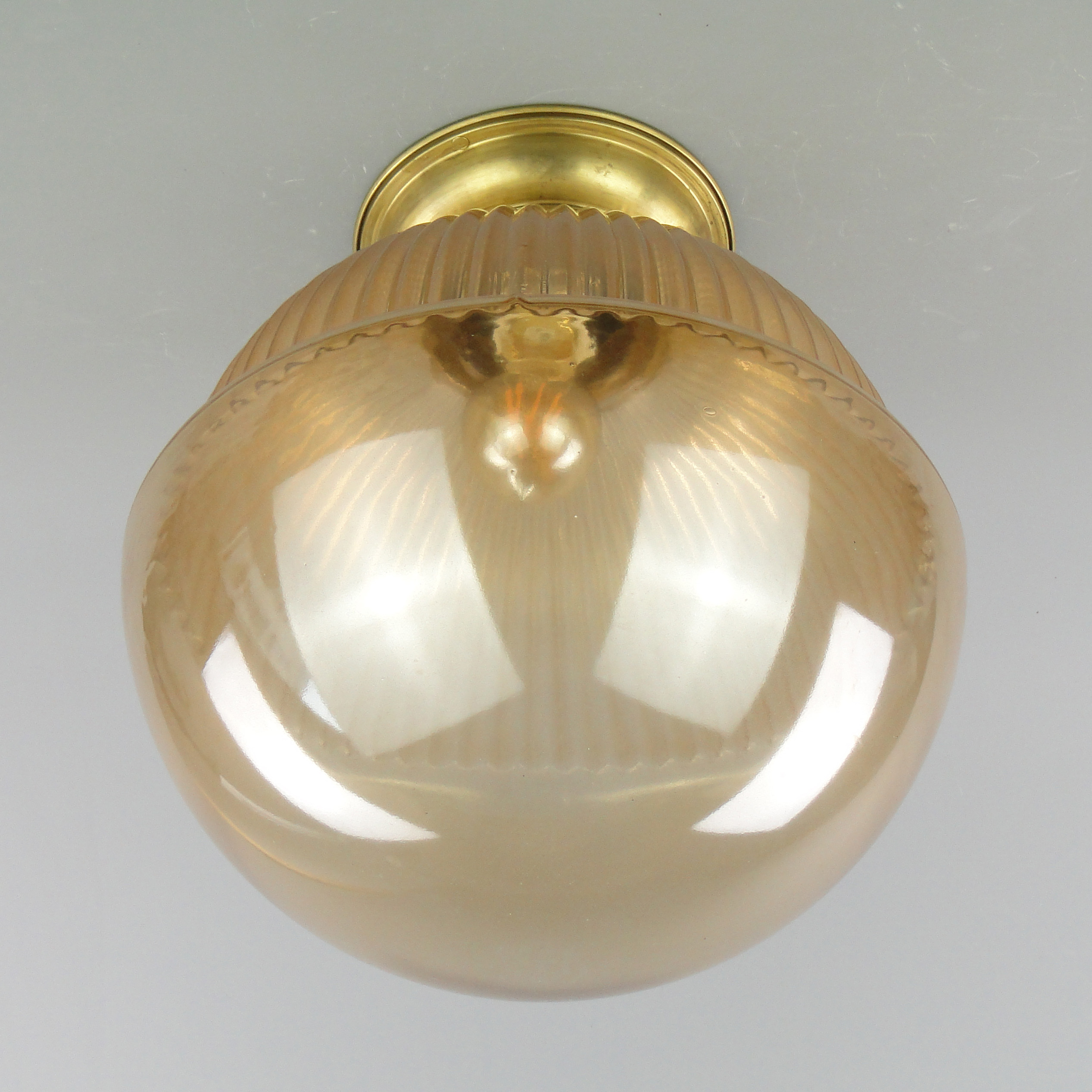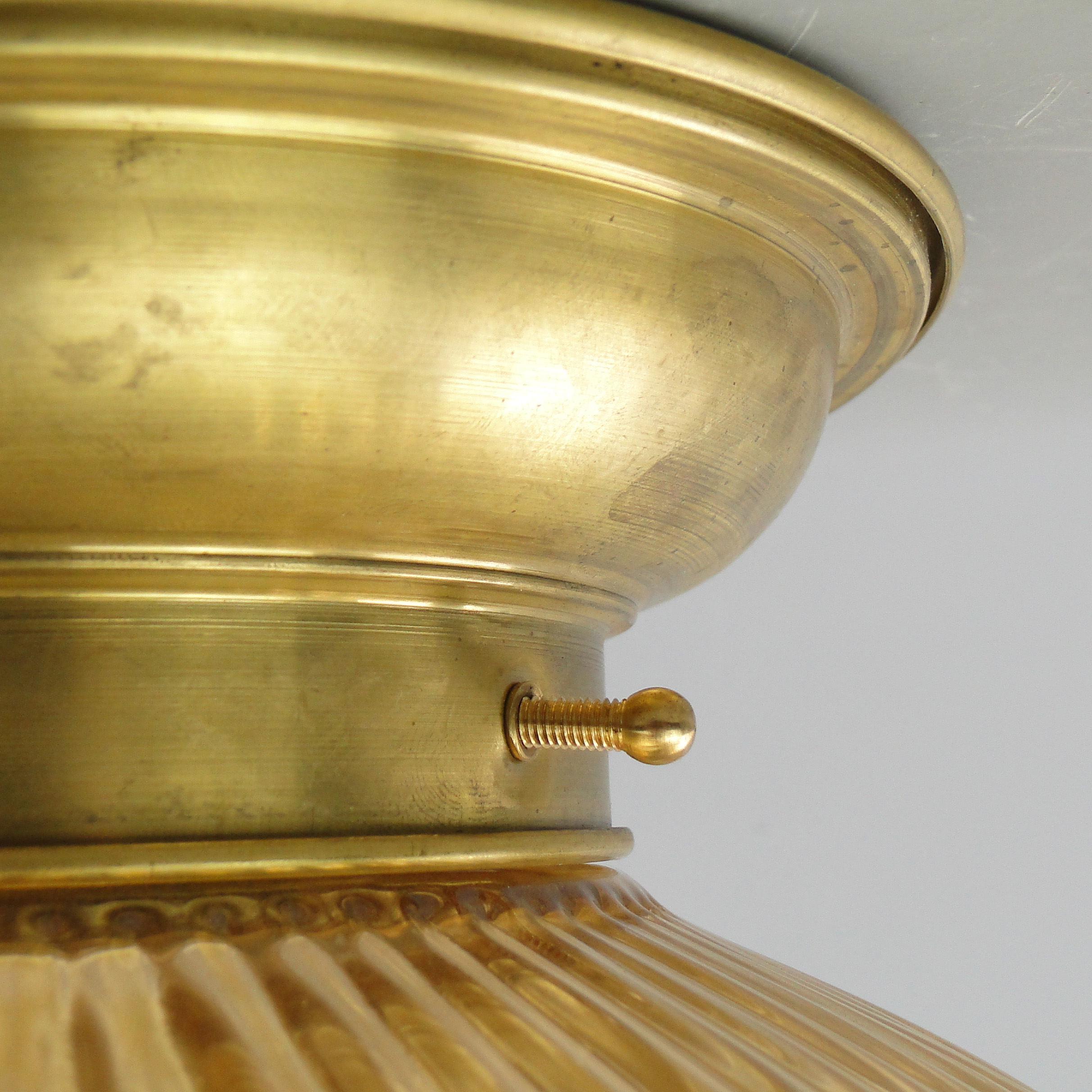 Podstawa lampy wykonana jest mosiądzu, klosz ze szkła profilowanego.