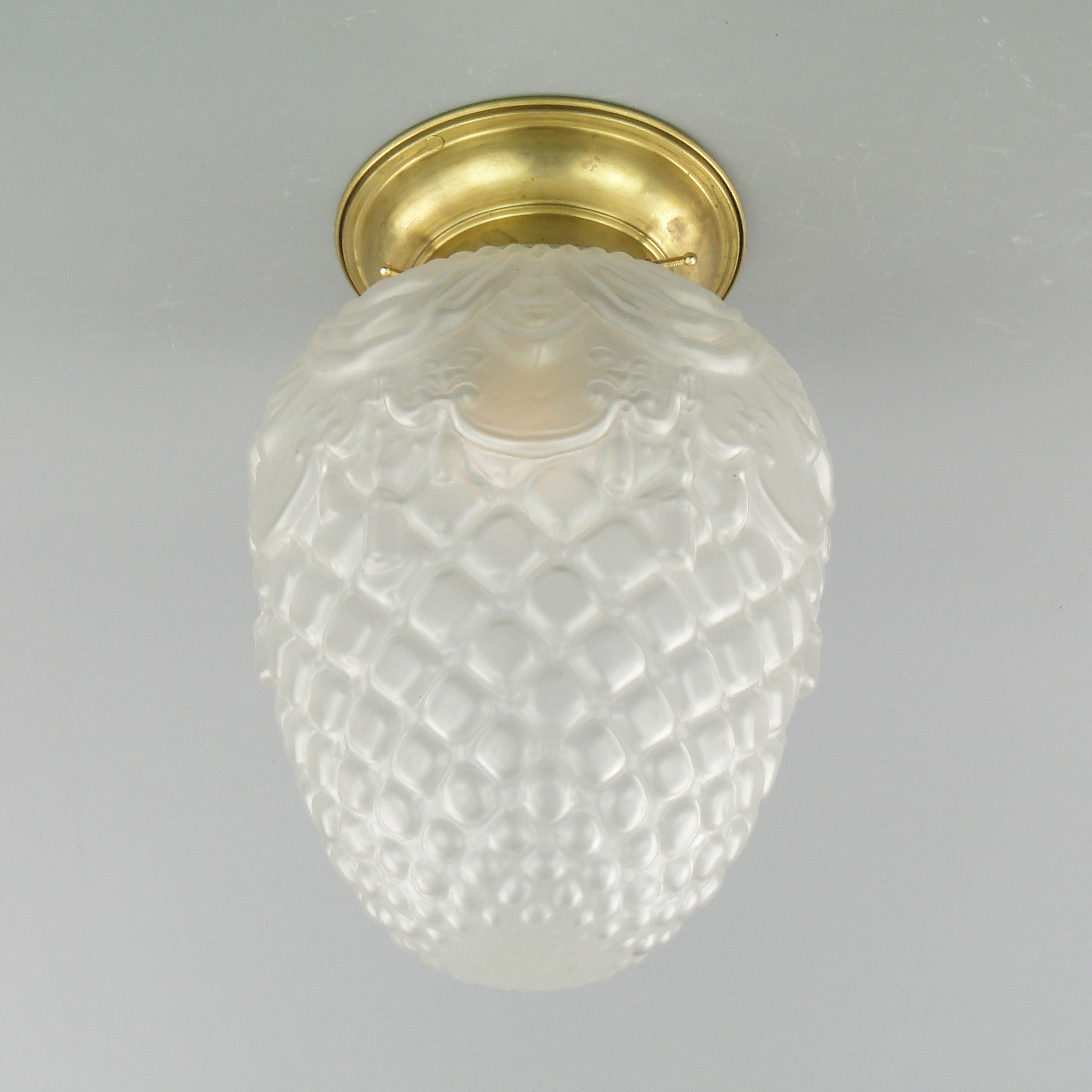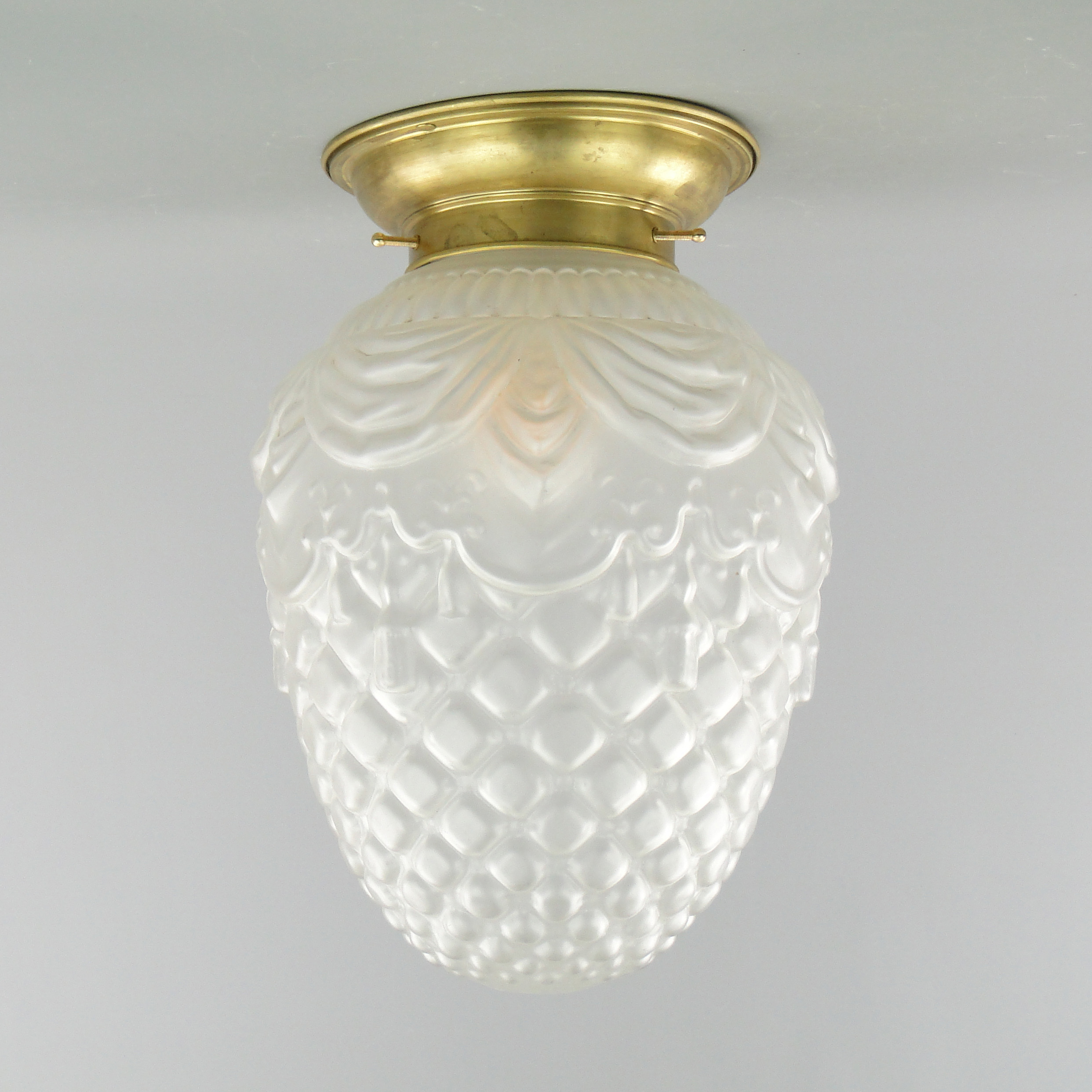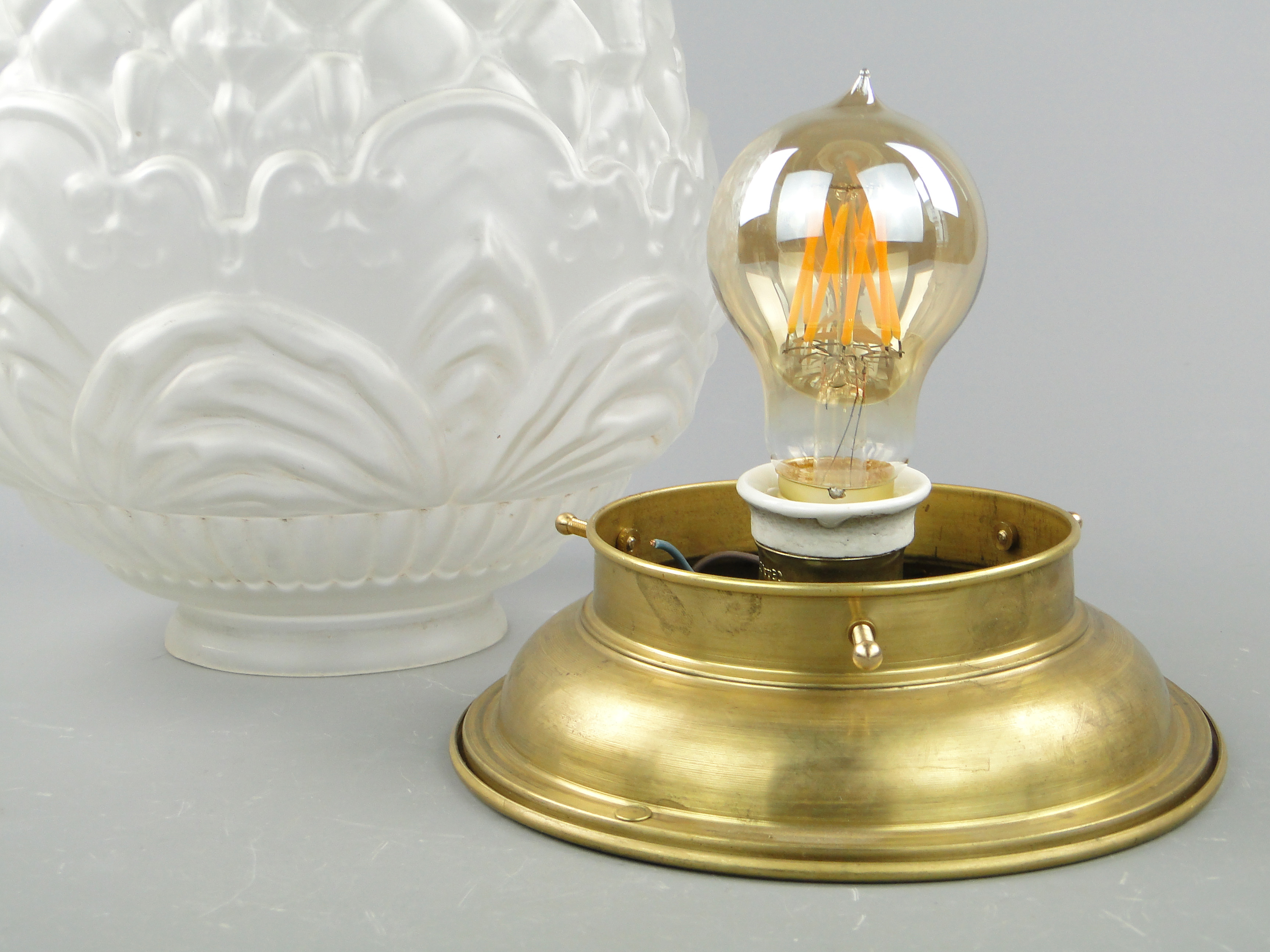 Podstawa lampy wykonana jest mosiądzu, klosz ze szkła profilowanego, bezbarwnego, wyprofilowanego w kształcie szyszki.