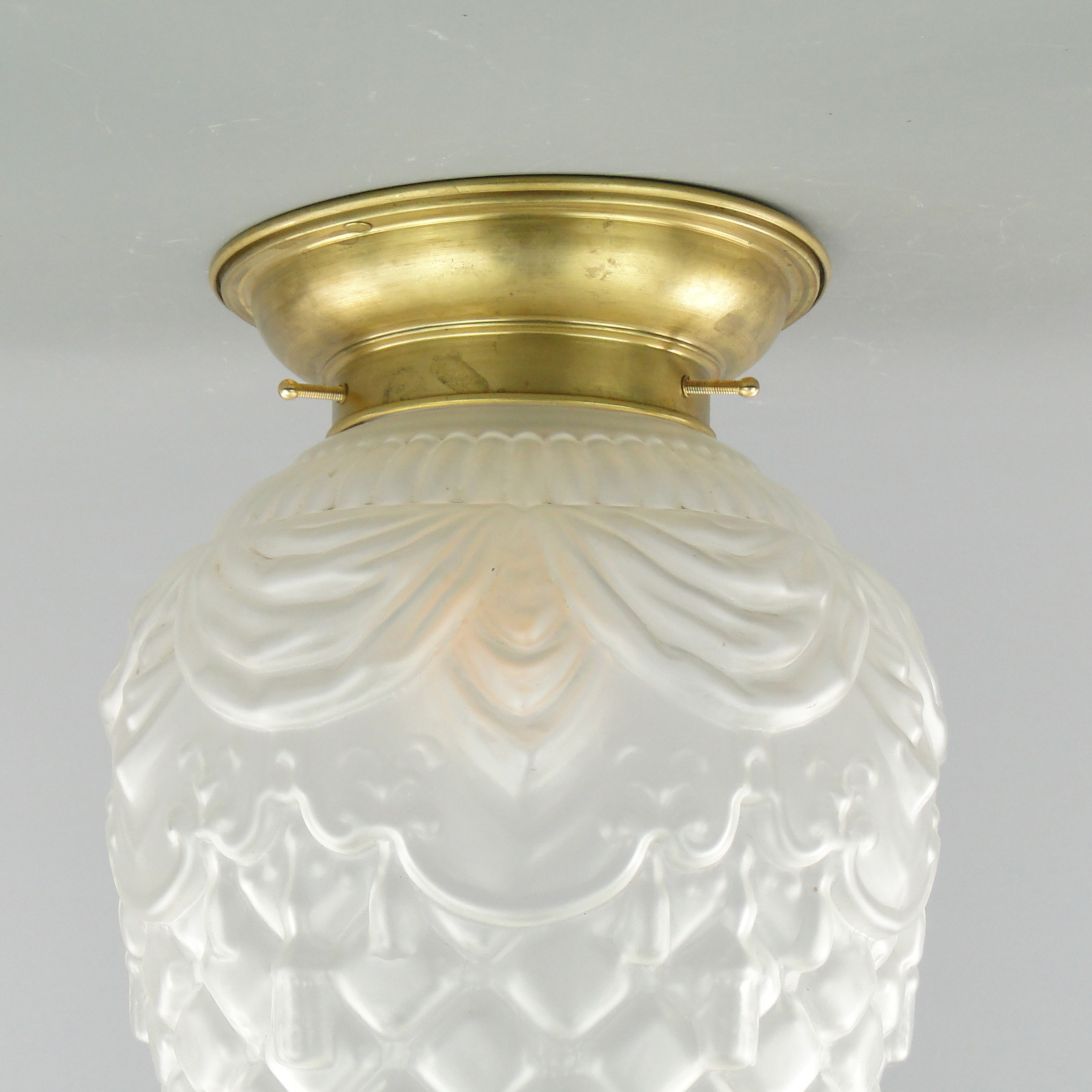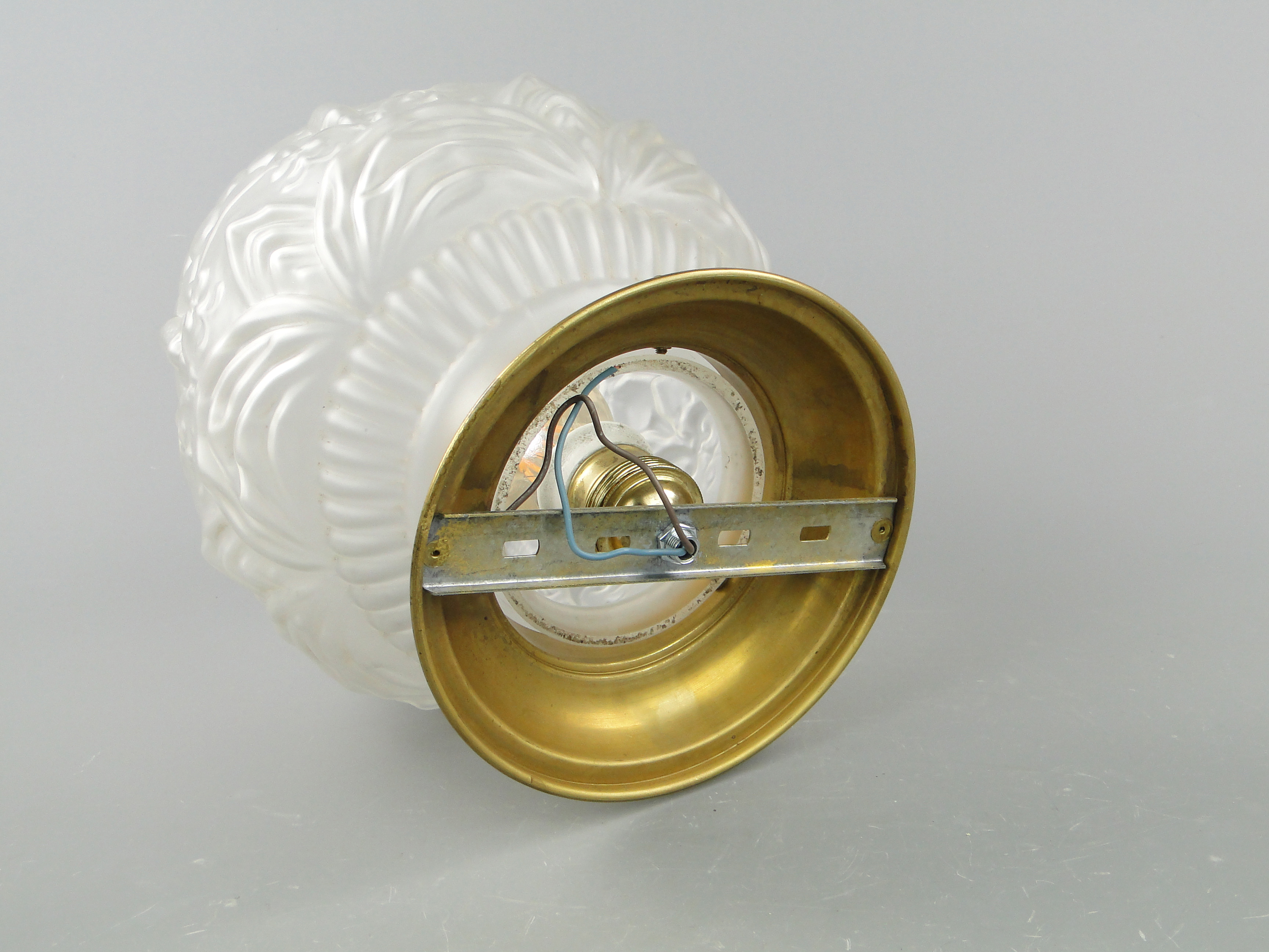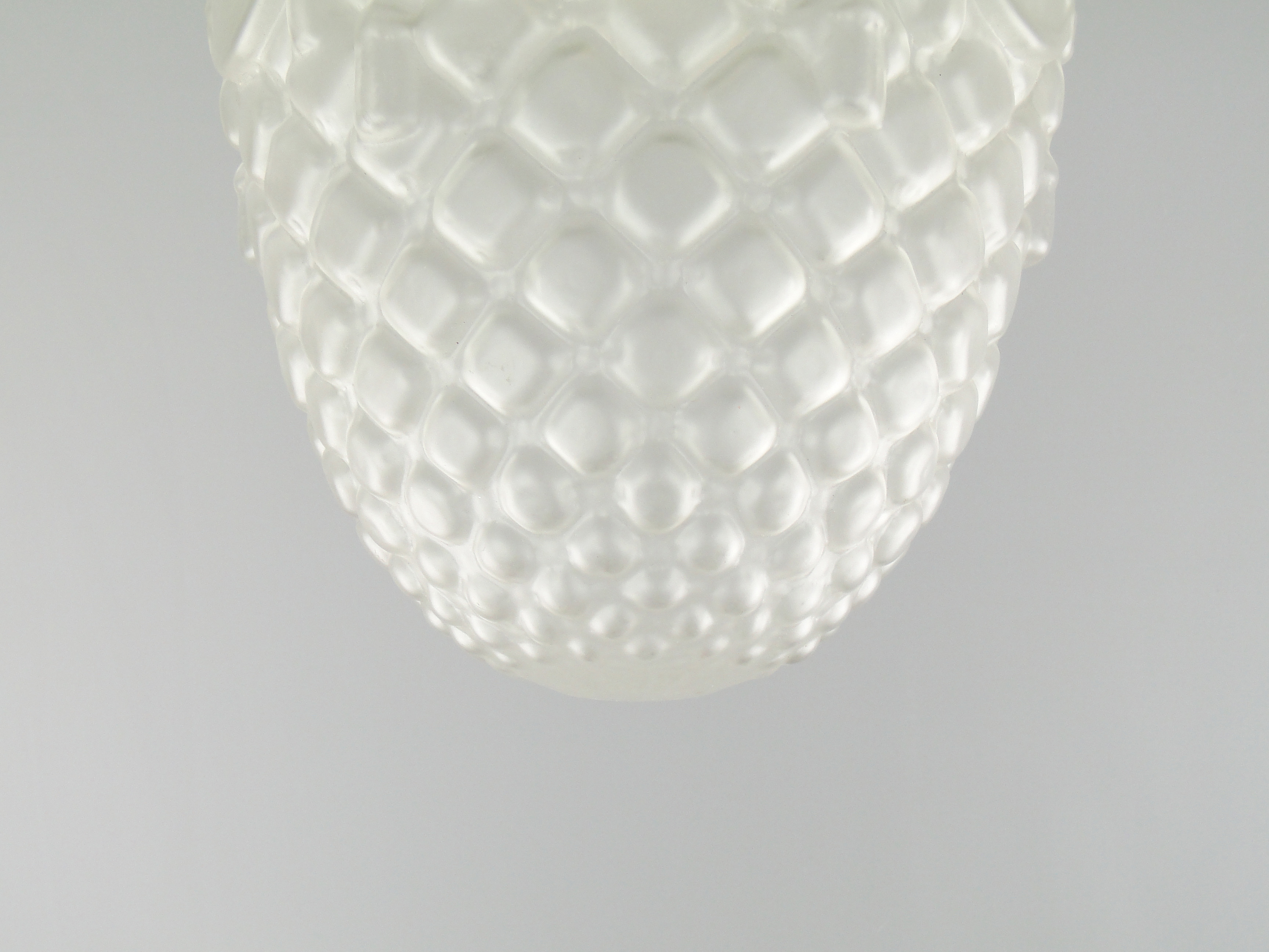 Podstawa lampy wykonana jest mosiądzu, klosz ze szkła profilowanego, bezbarwnego, wyprofilowanego w kształcie szyszki.