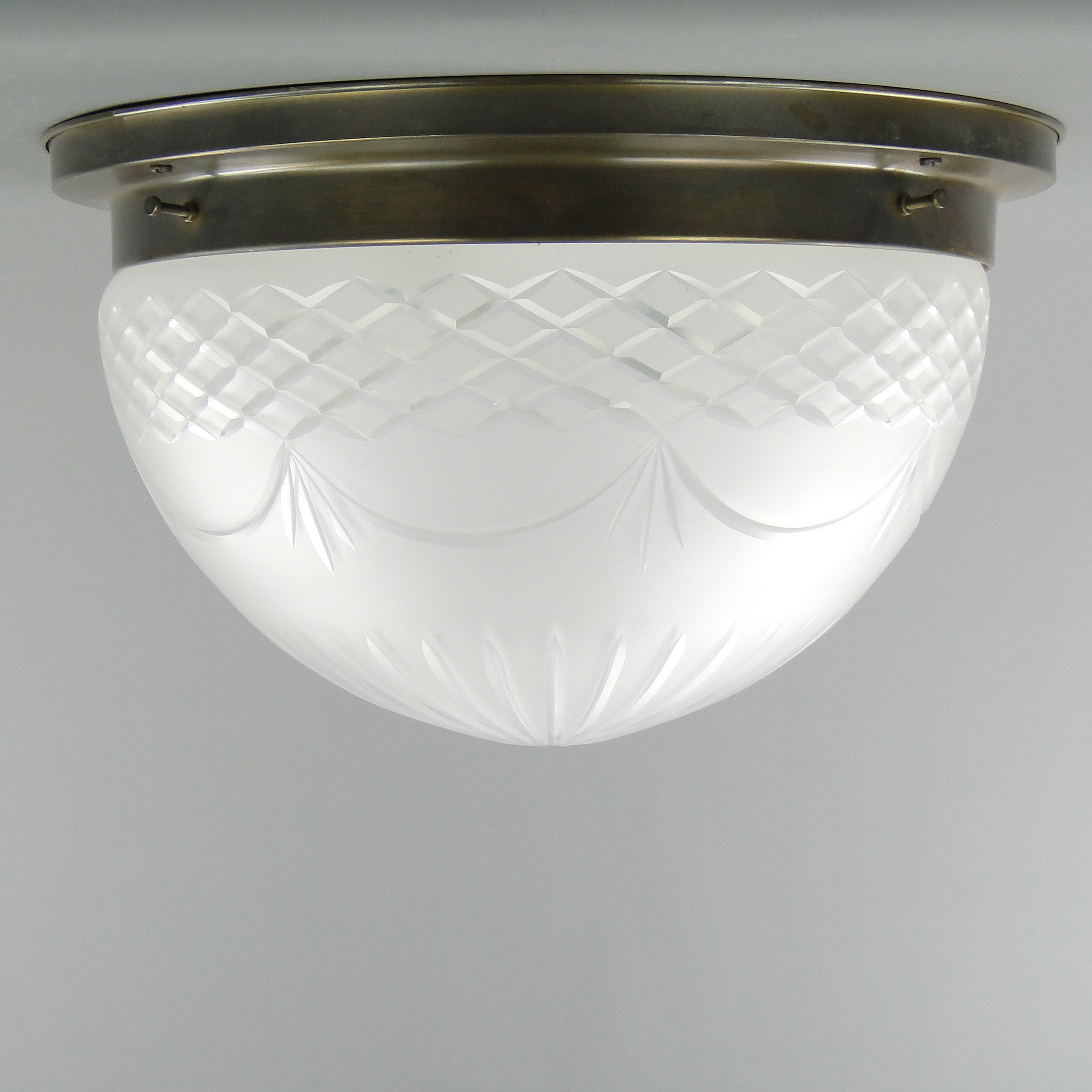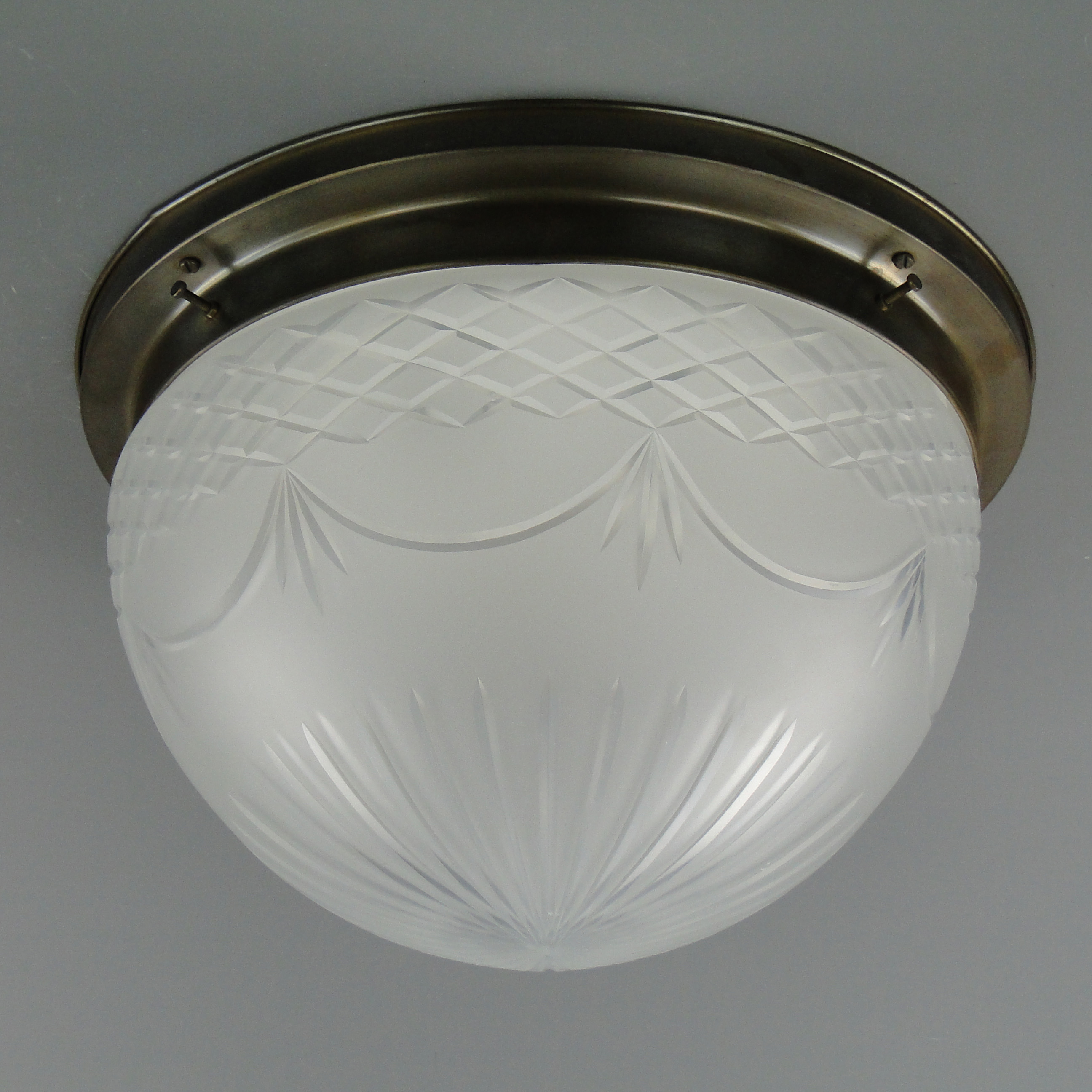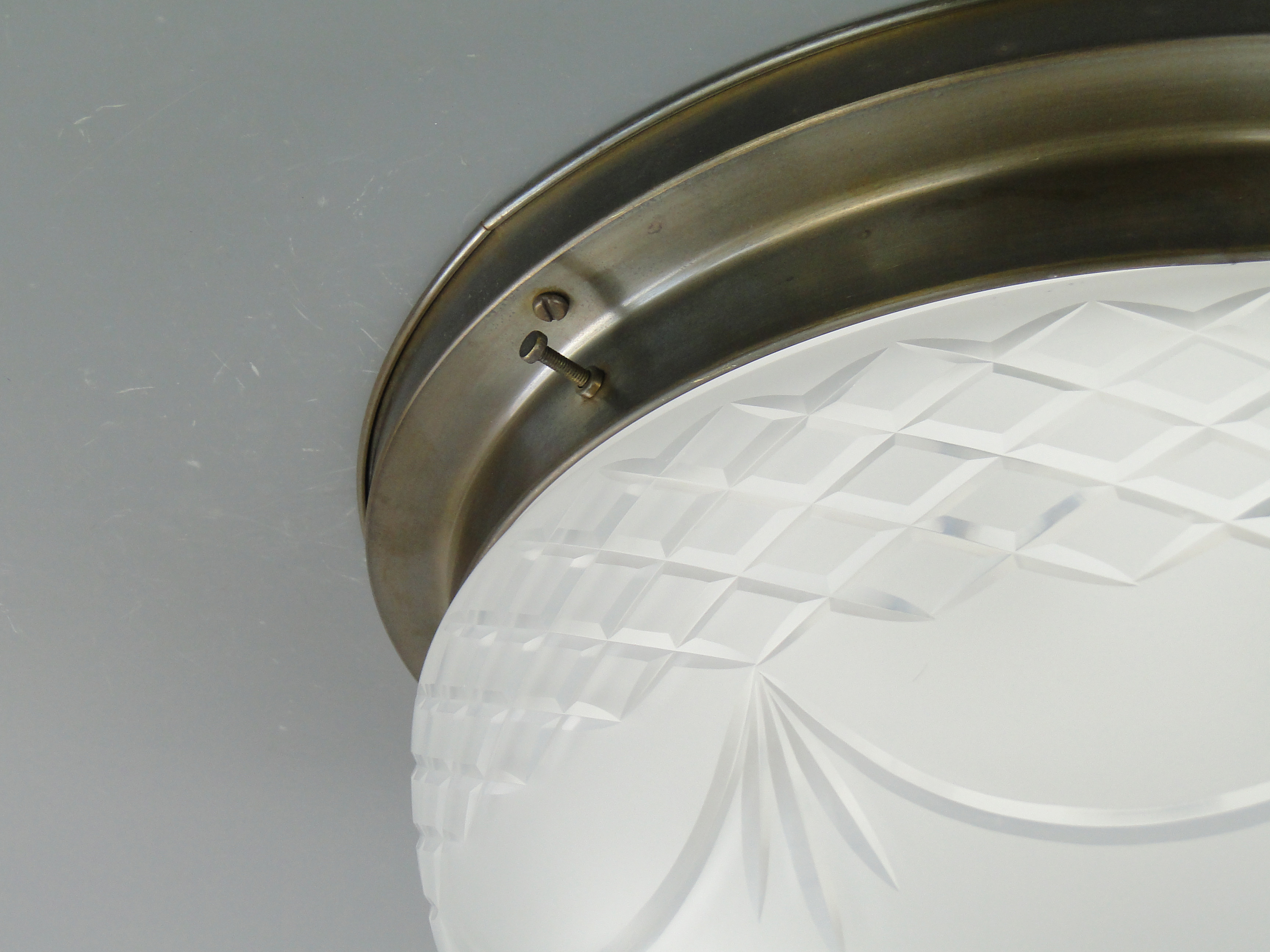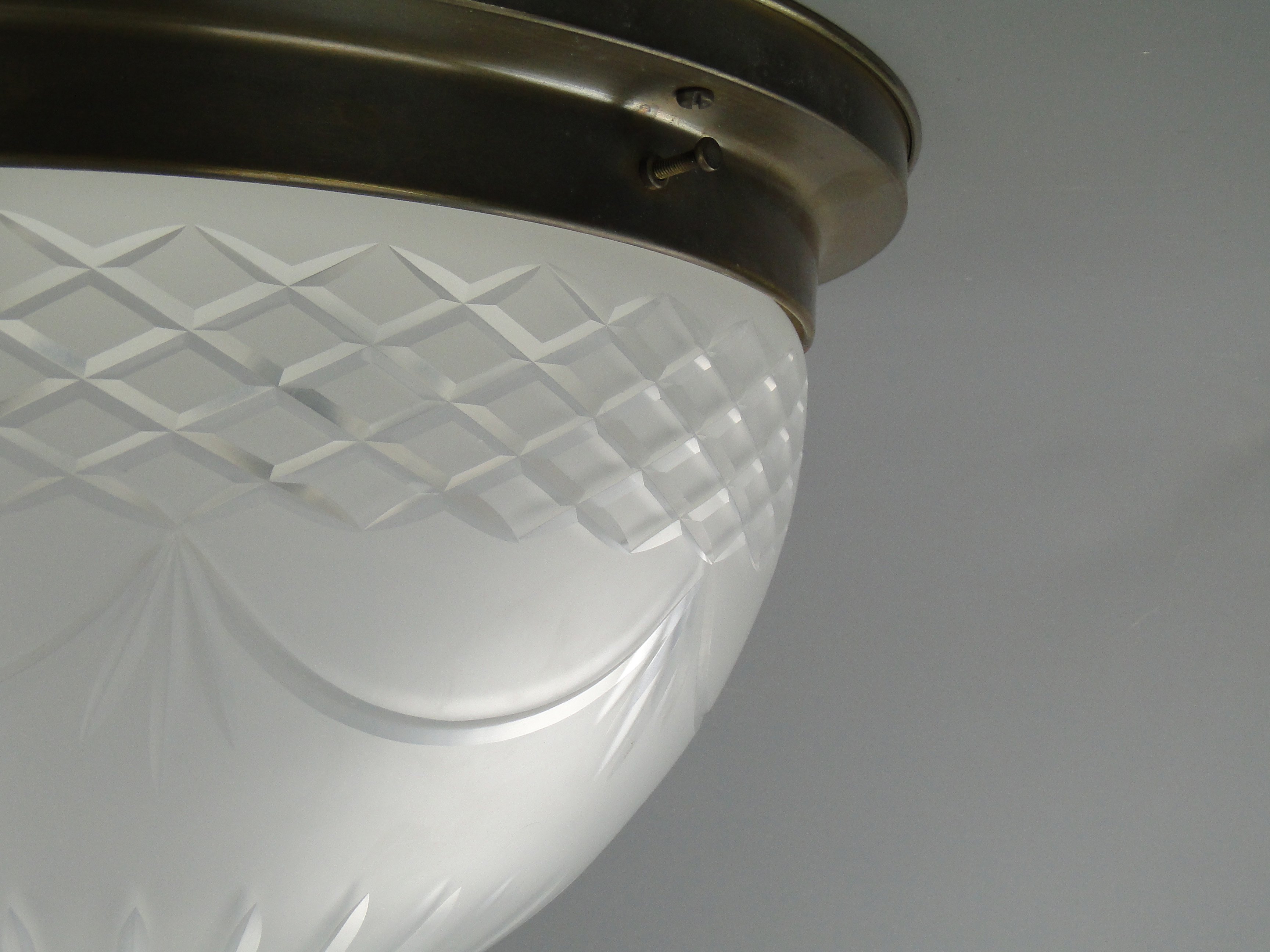 Kołnierz lampy mosiądzu, klosz ze szkła profilowanego, zdobionego szlifem mocowany jest za pomocą 3 śrubek.
