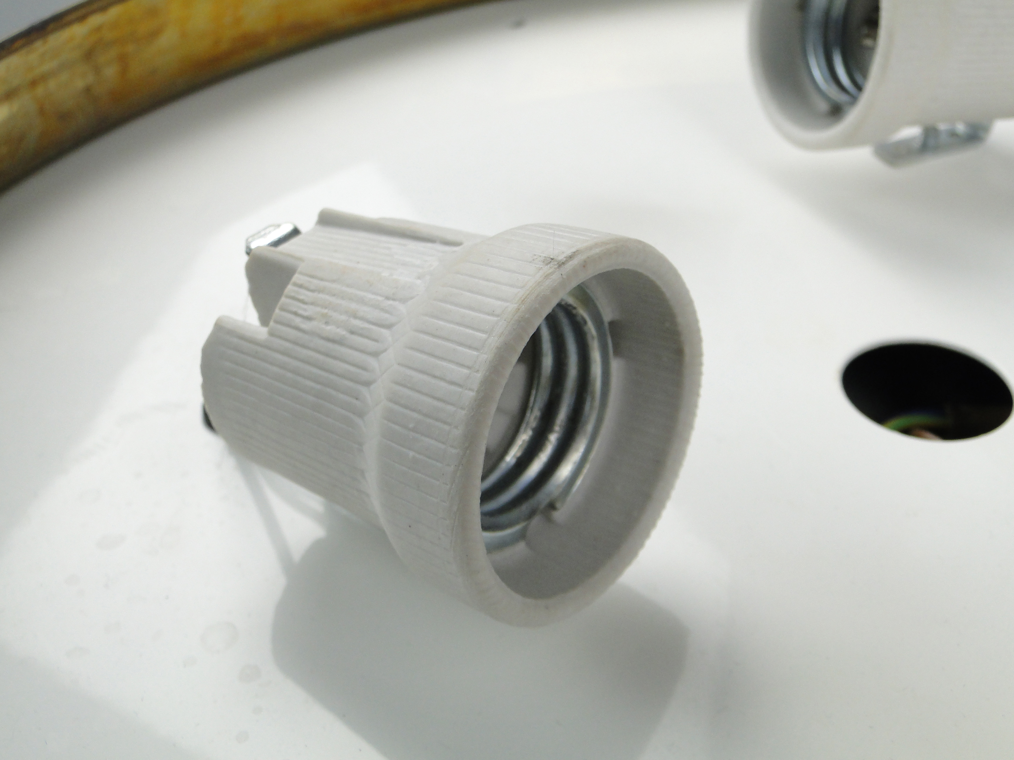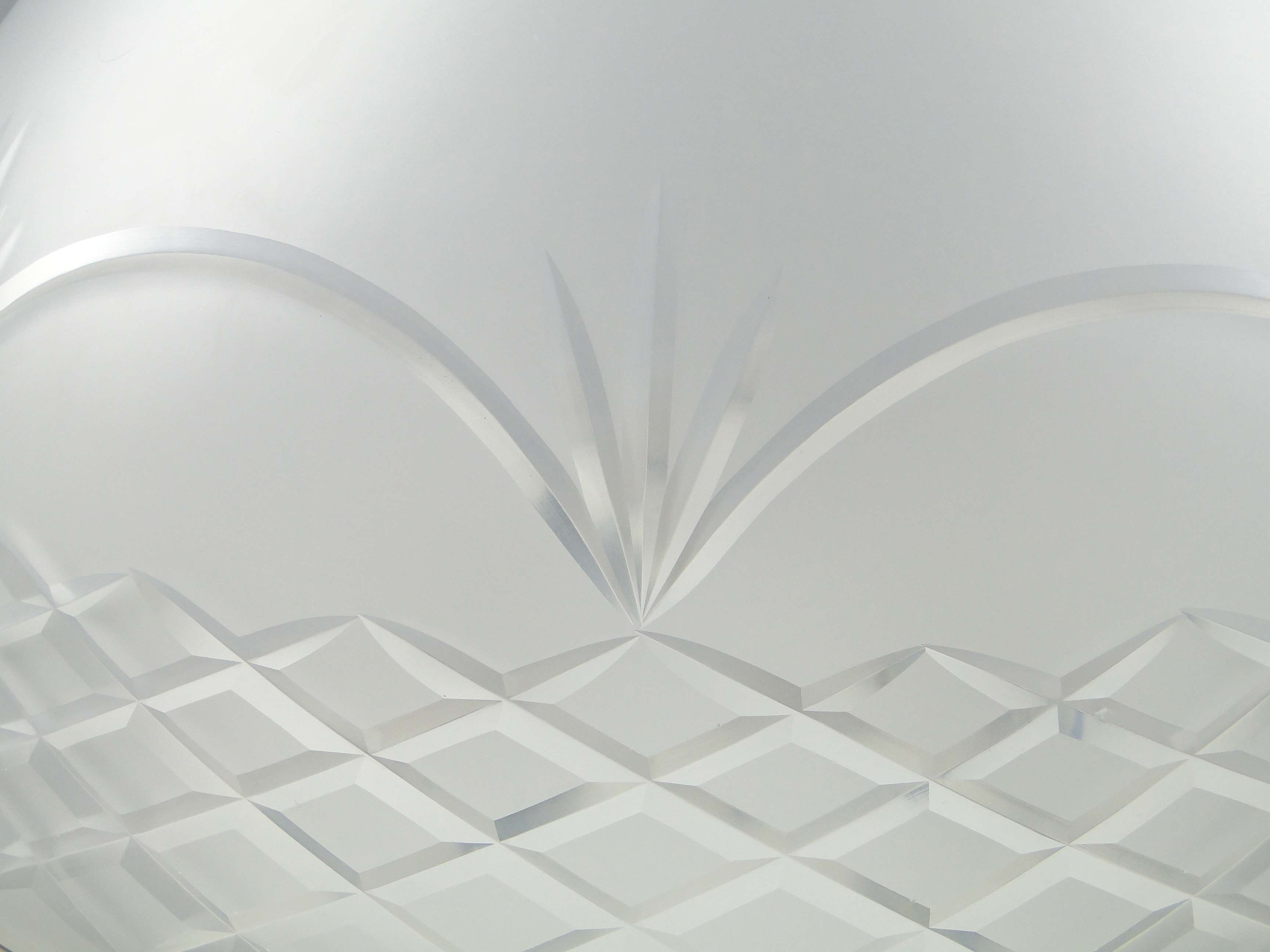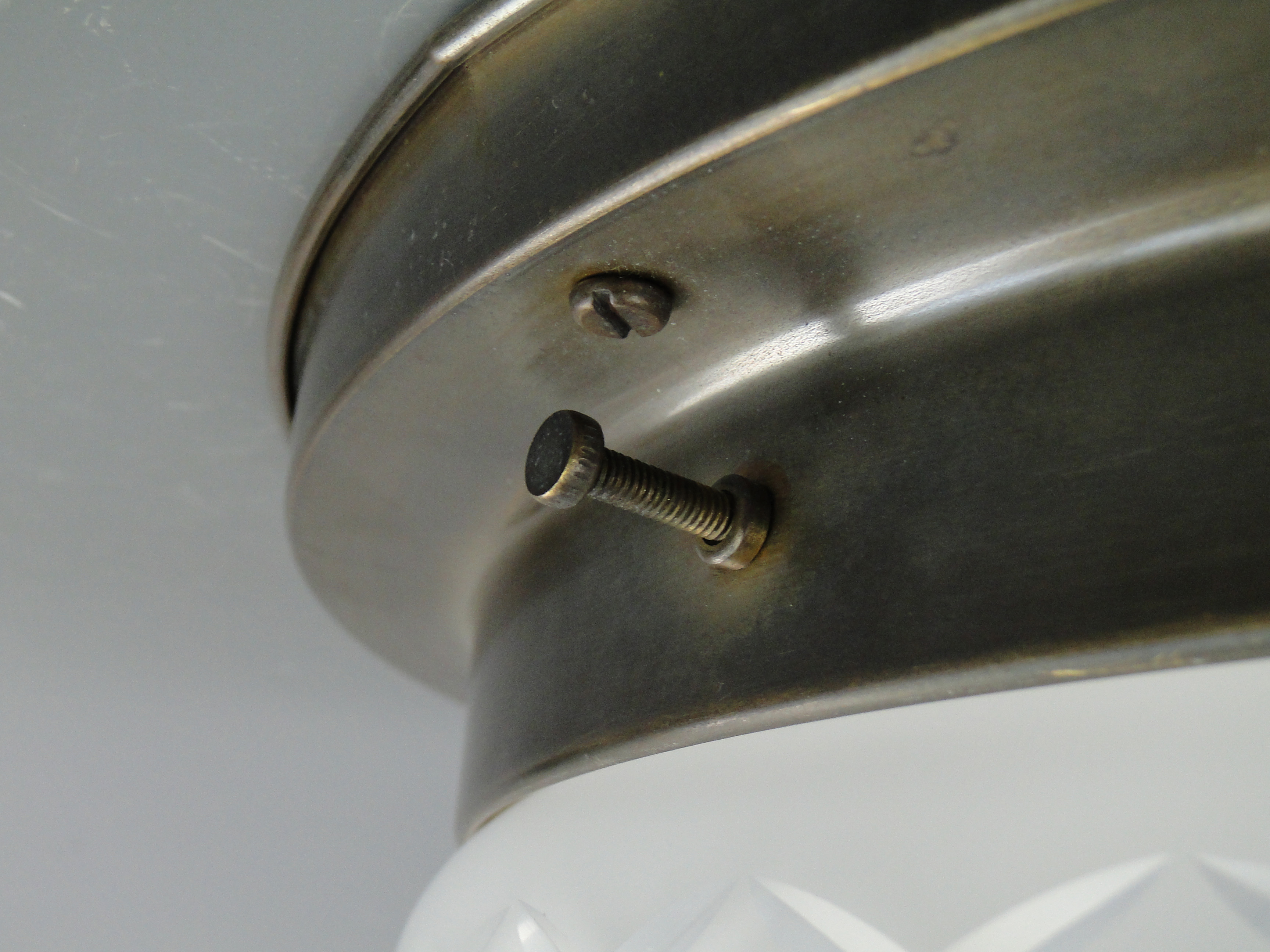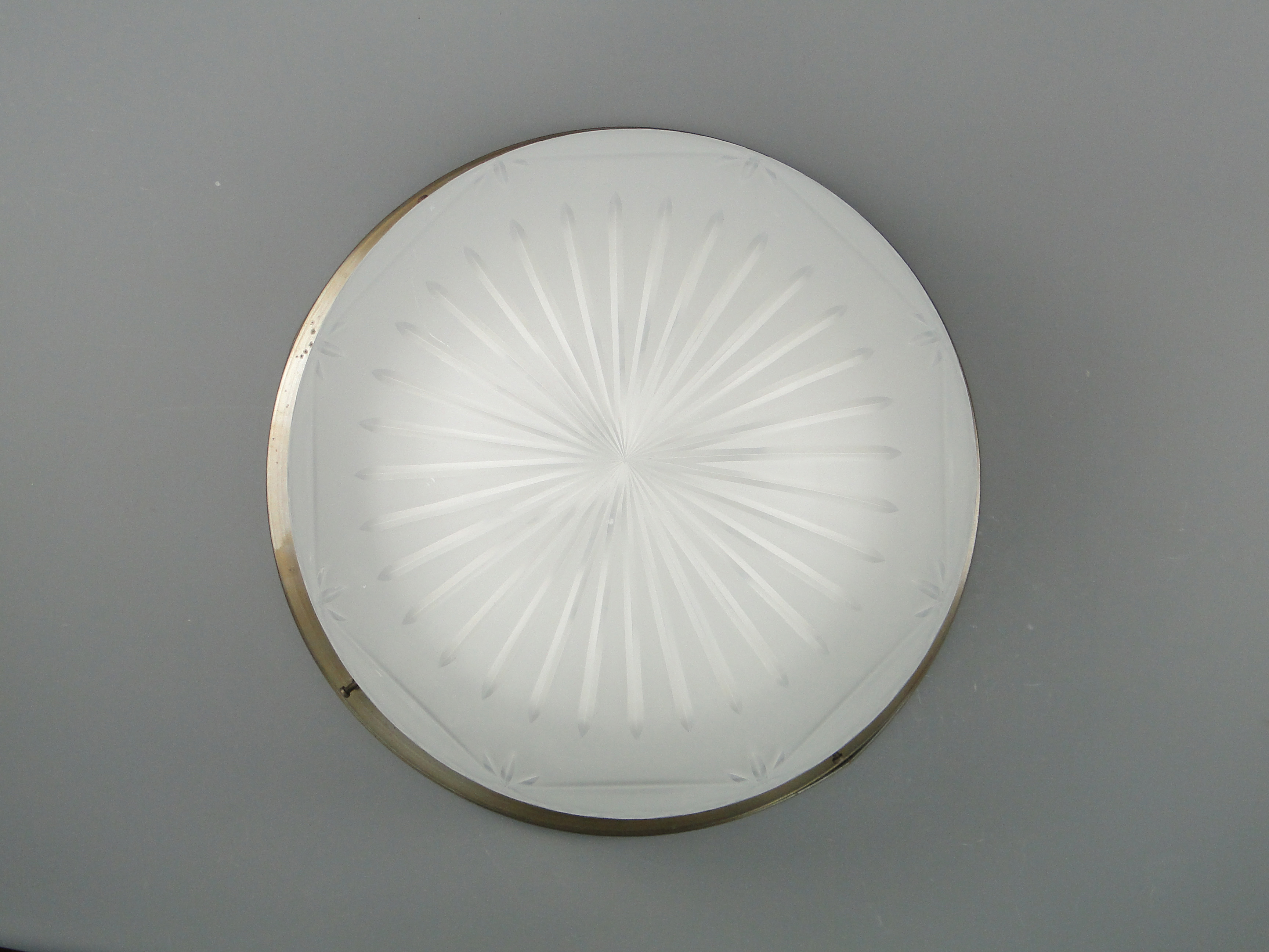Kołnierz lampy mosiądzu, klosz ze szkła profilowanego, zdobionego szlifem mocowany jest za pomocą 3 śrubek.