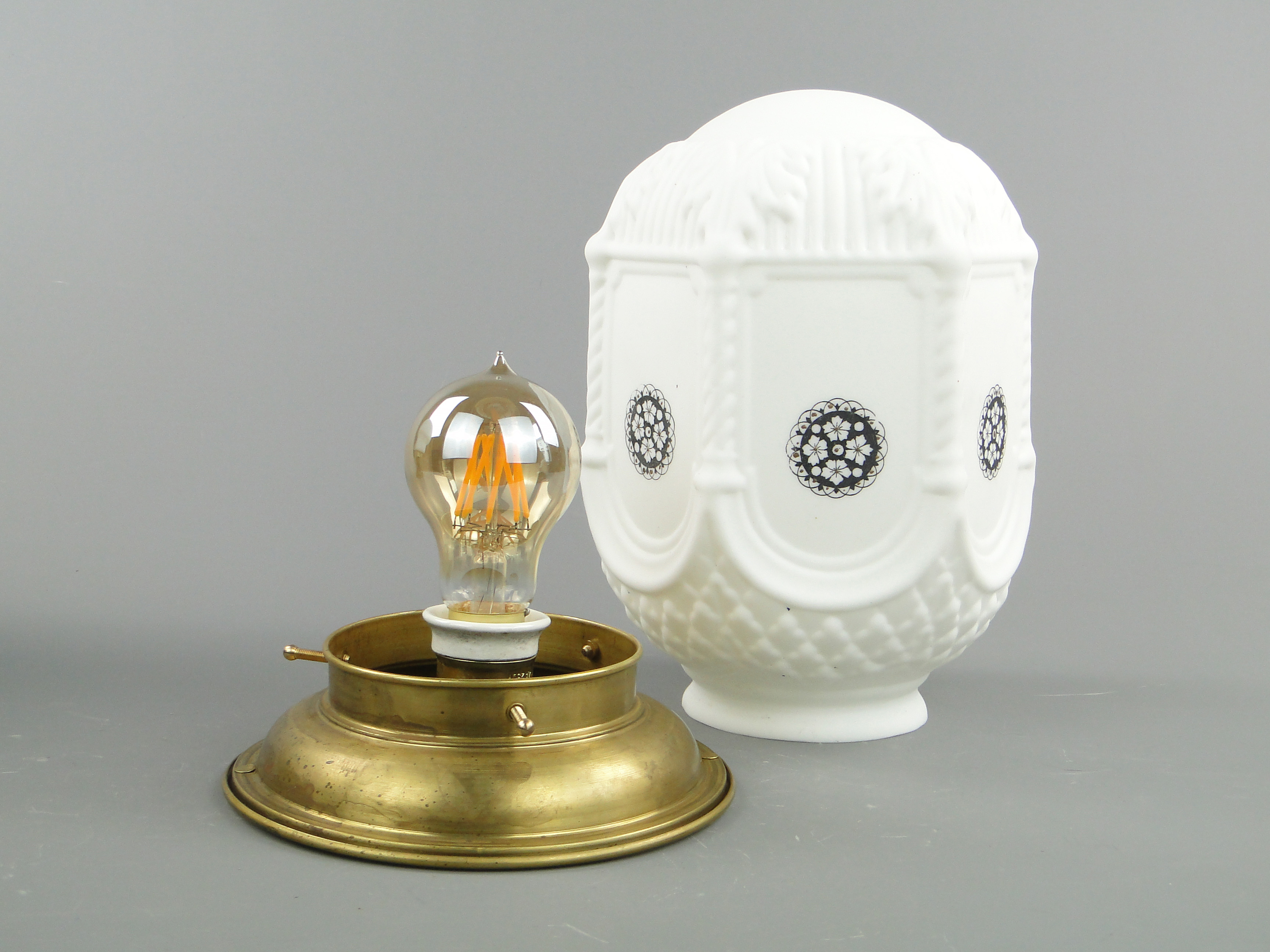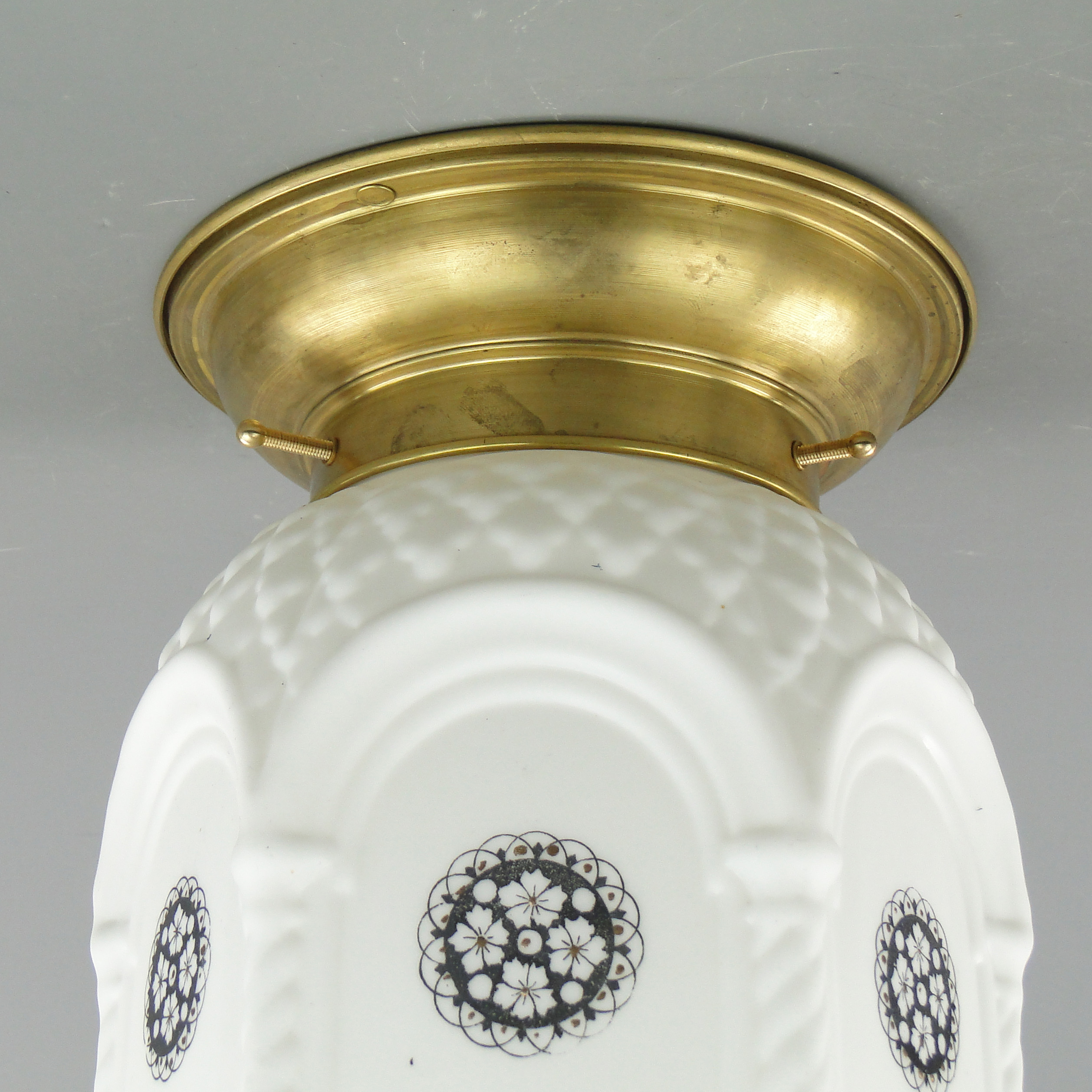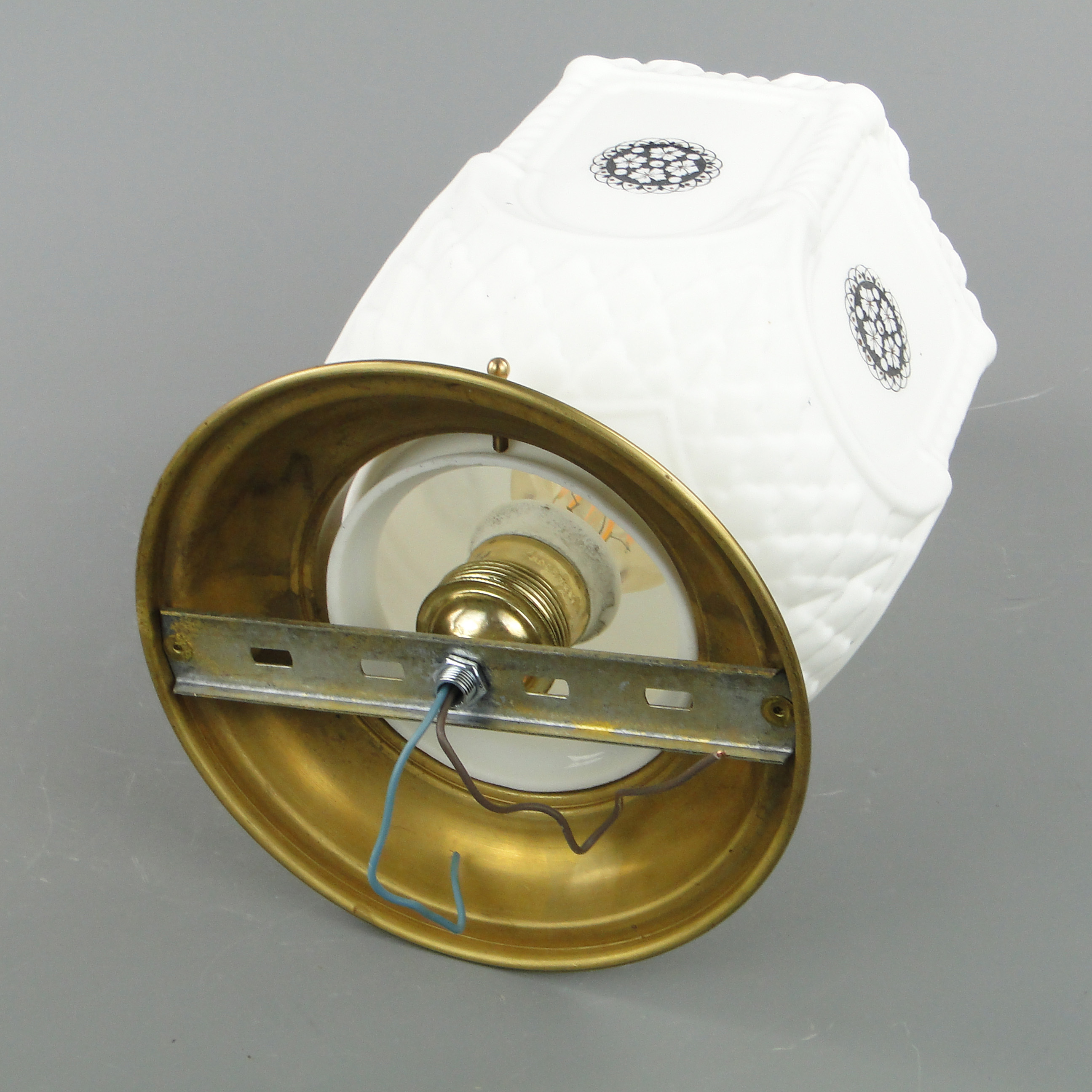 Podstawa lampy wykonana jest mosiądzu, klosz ze szkła profilowanego, białego, ozdobionego czarnymi wzorami.