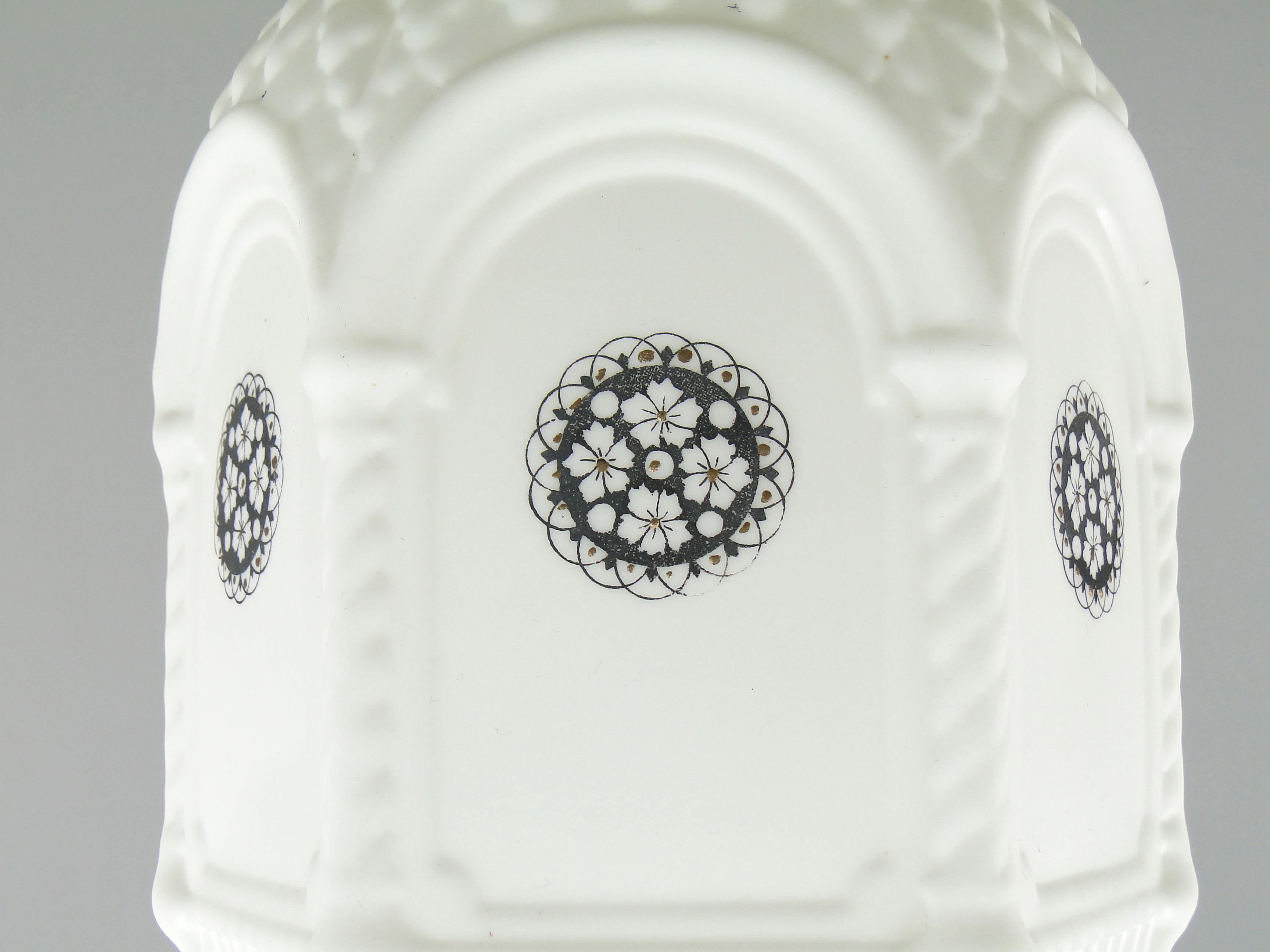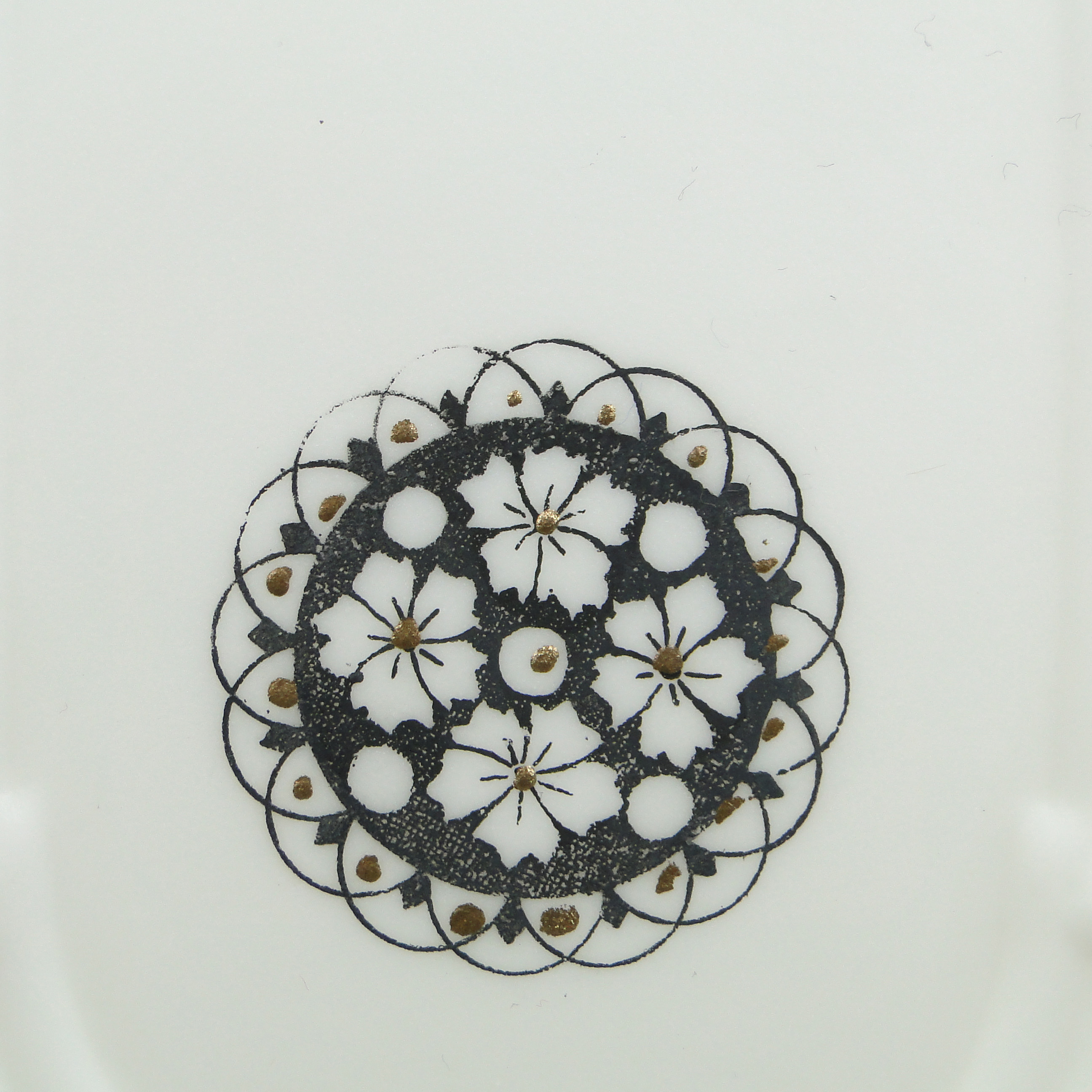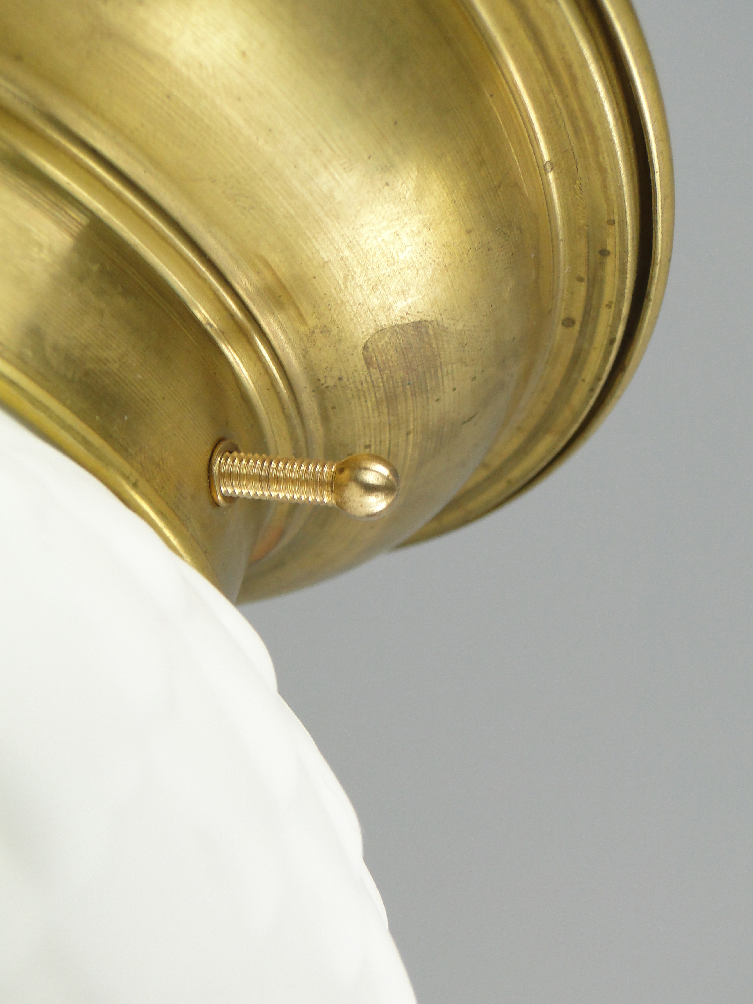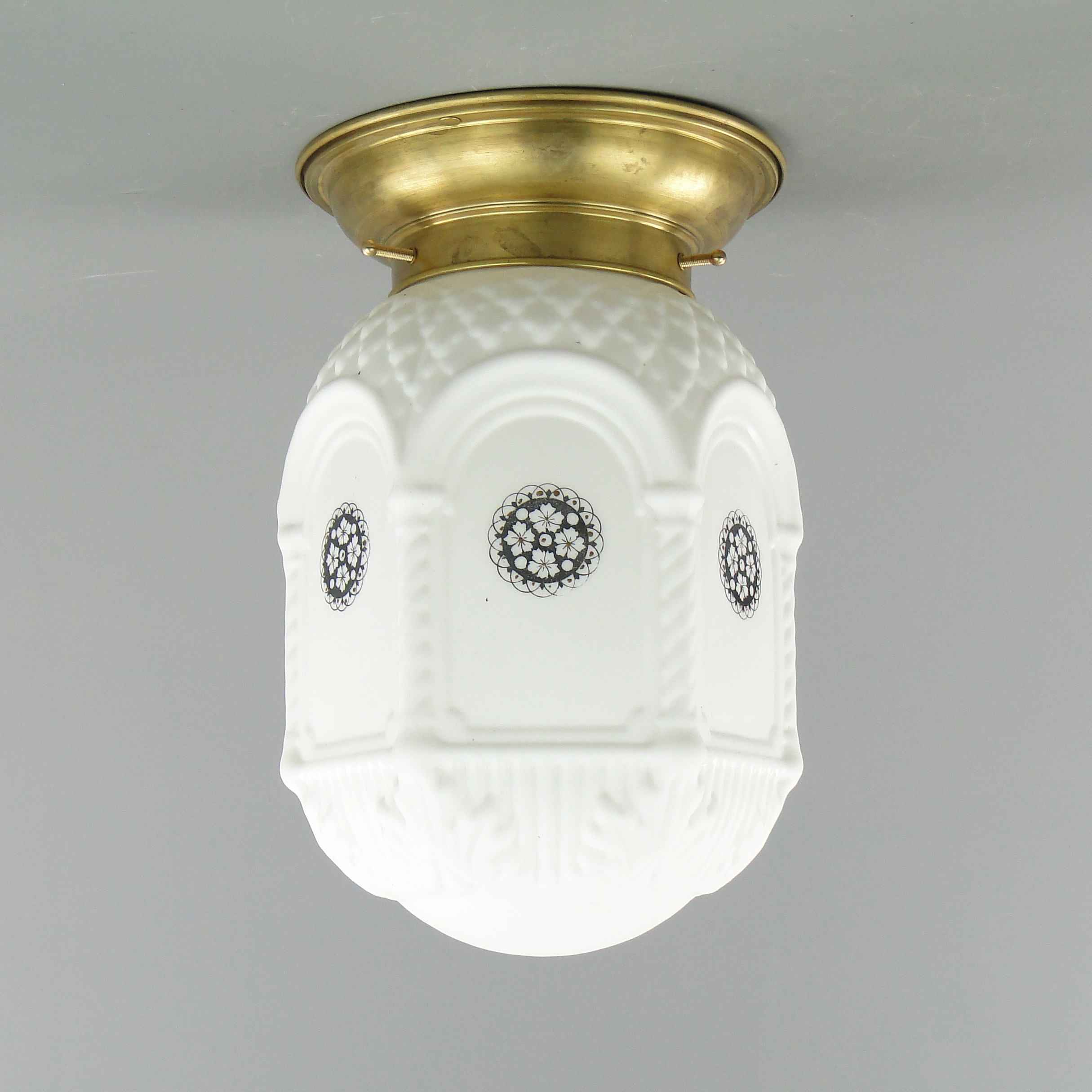 Podstawa lampy wykonana jest mosiądzu, klosz ze szkła profilowanego, białego, ozdobionego czarnymi wzorami.