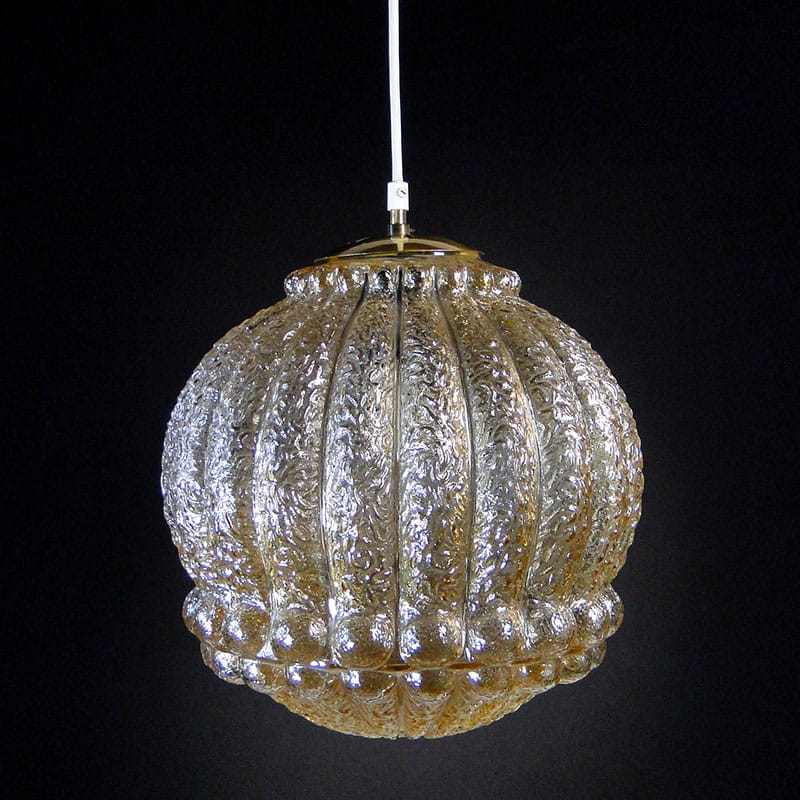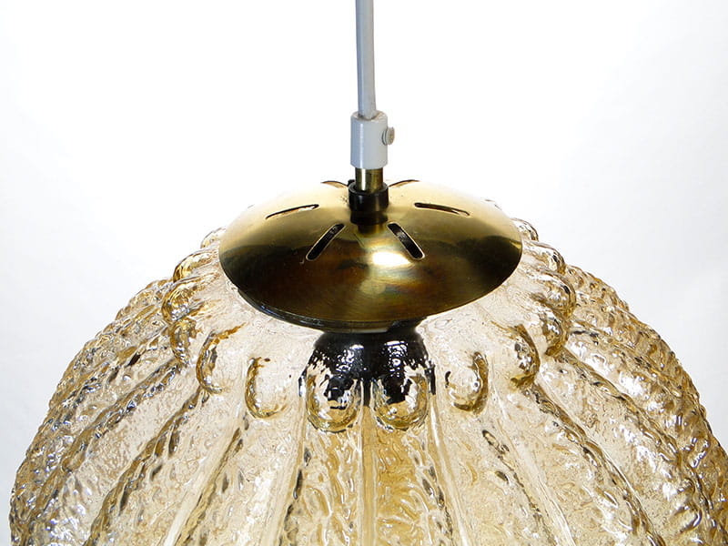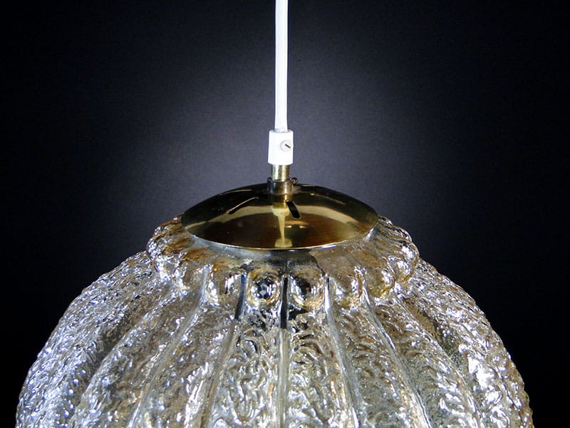 Wisząca lampa, wykonana z tworzywa i szkła. Szeroki klosz lampy wykonany został ze szkła profilowanego.