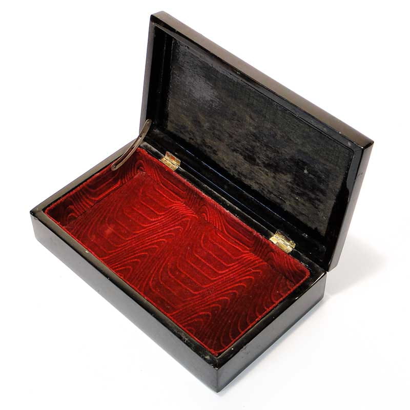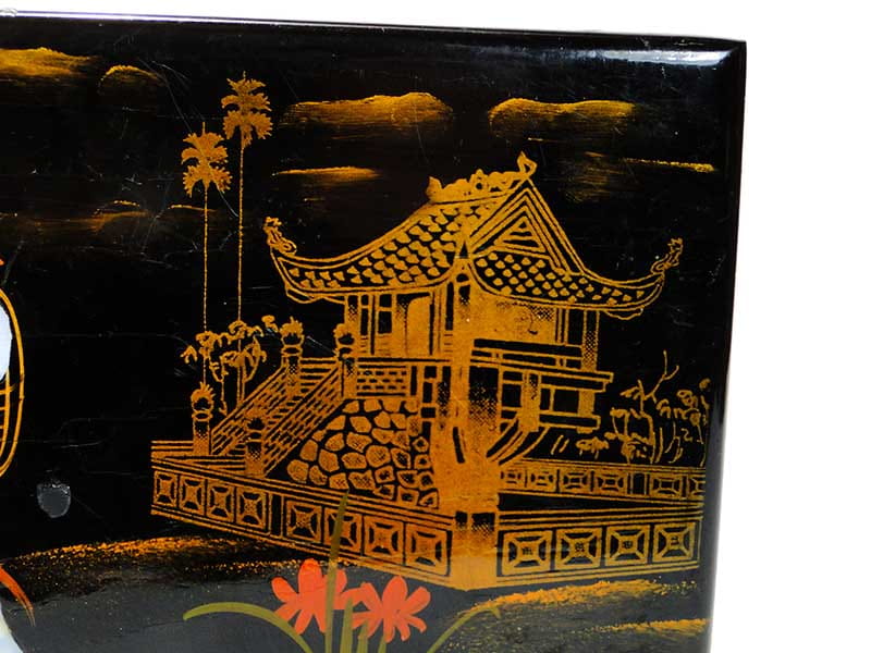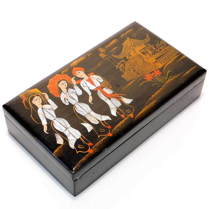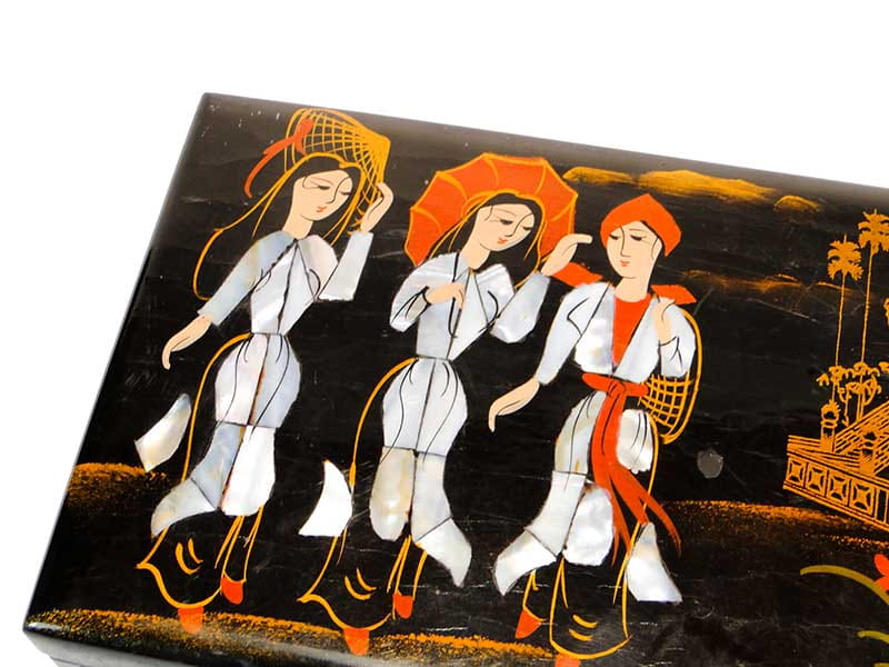 Kaseta wykonana jest z drewna, pokrytego laką i zdobionego malaturą z motywami kobiet ubranych w kimona. Wnętrze wyłożone tkaniną.