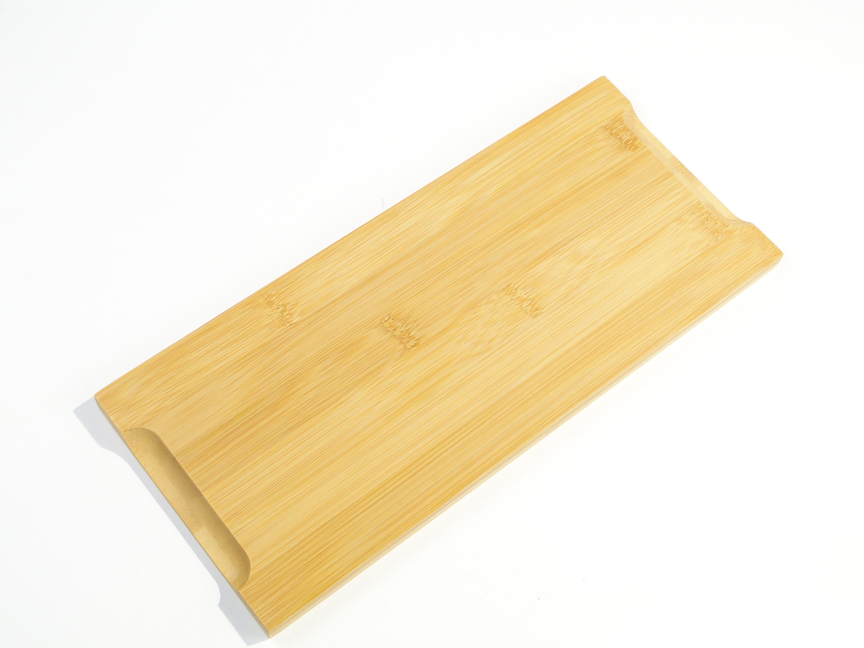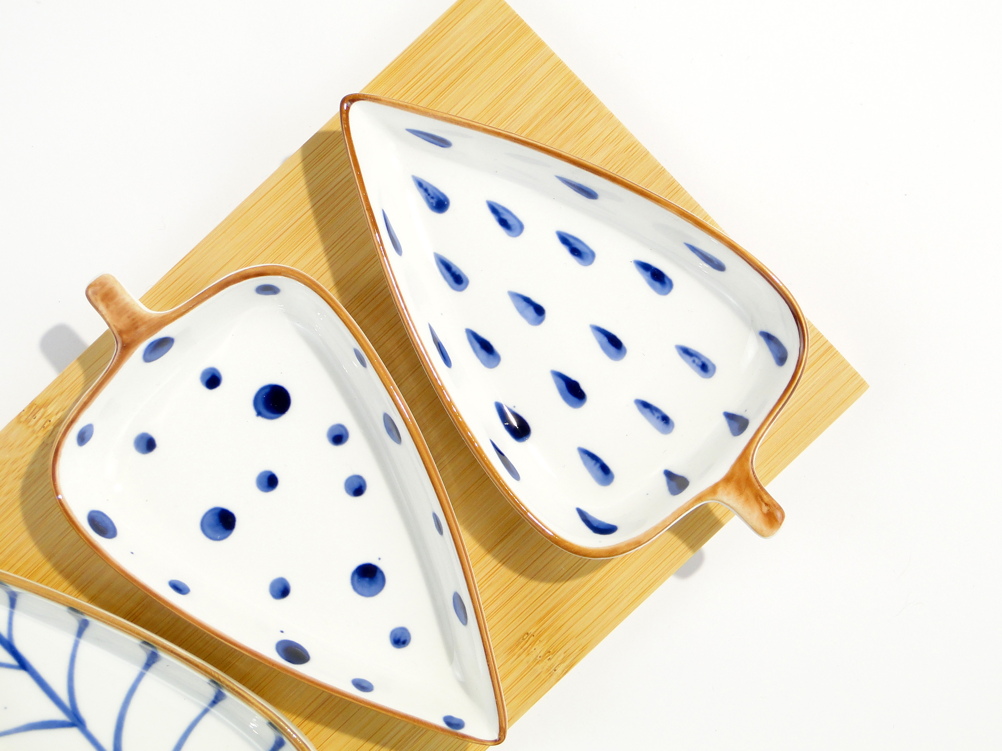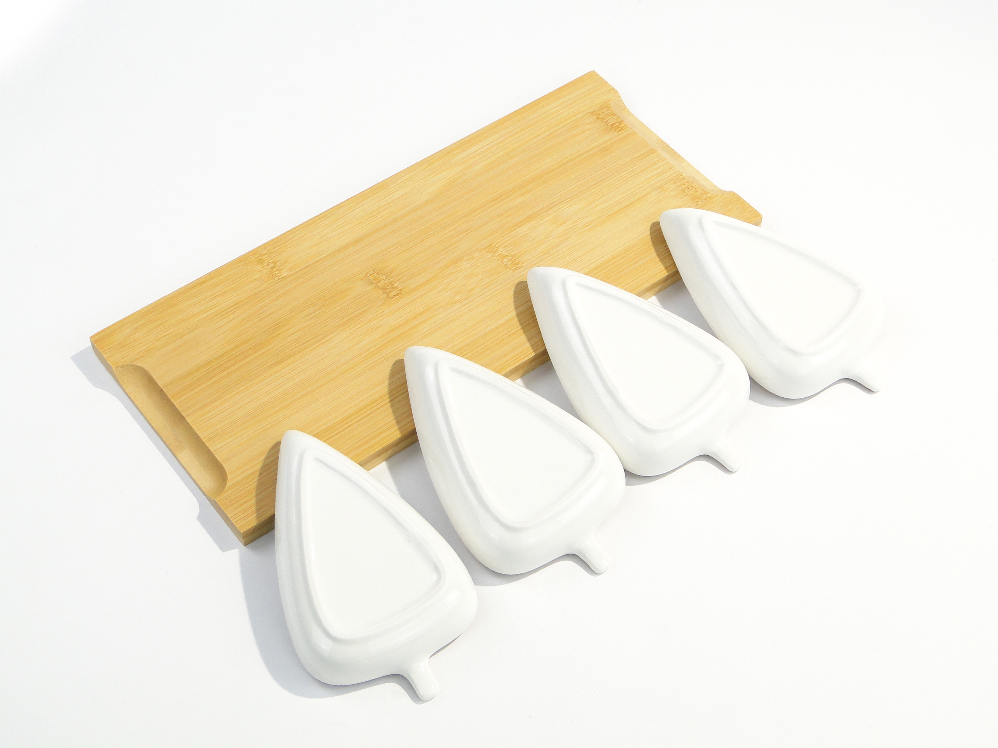 Miseczki maja kształt liści i położone sa na bambusowej tacy.
