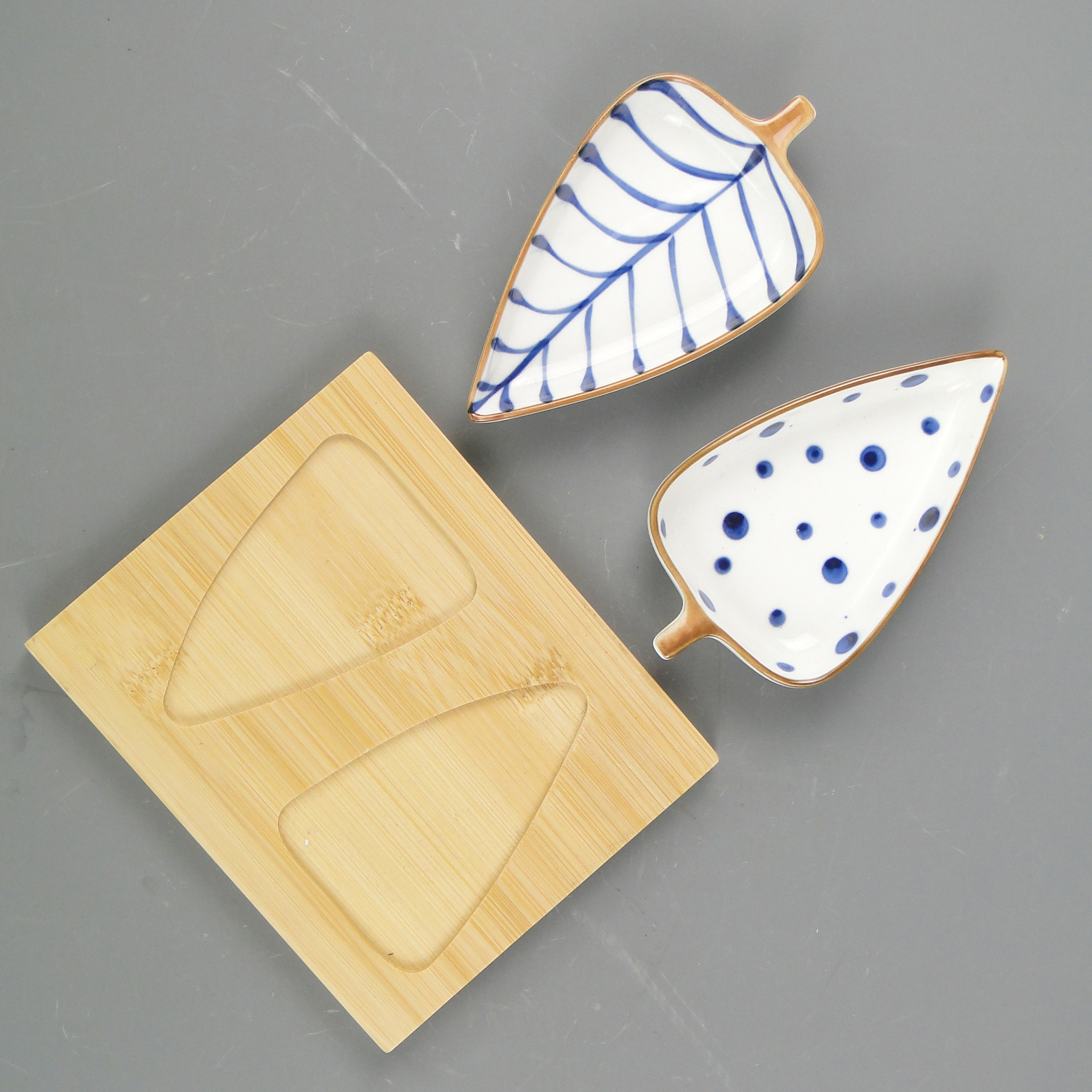 Miseczki maja kształt liści i leżą na bambusowej tacy.
